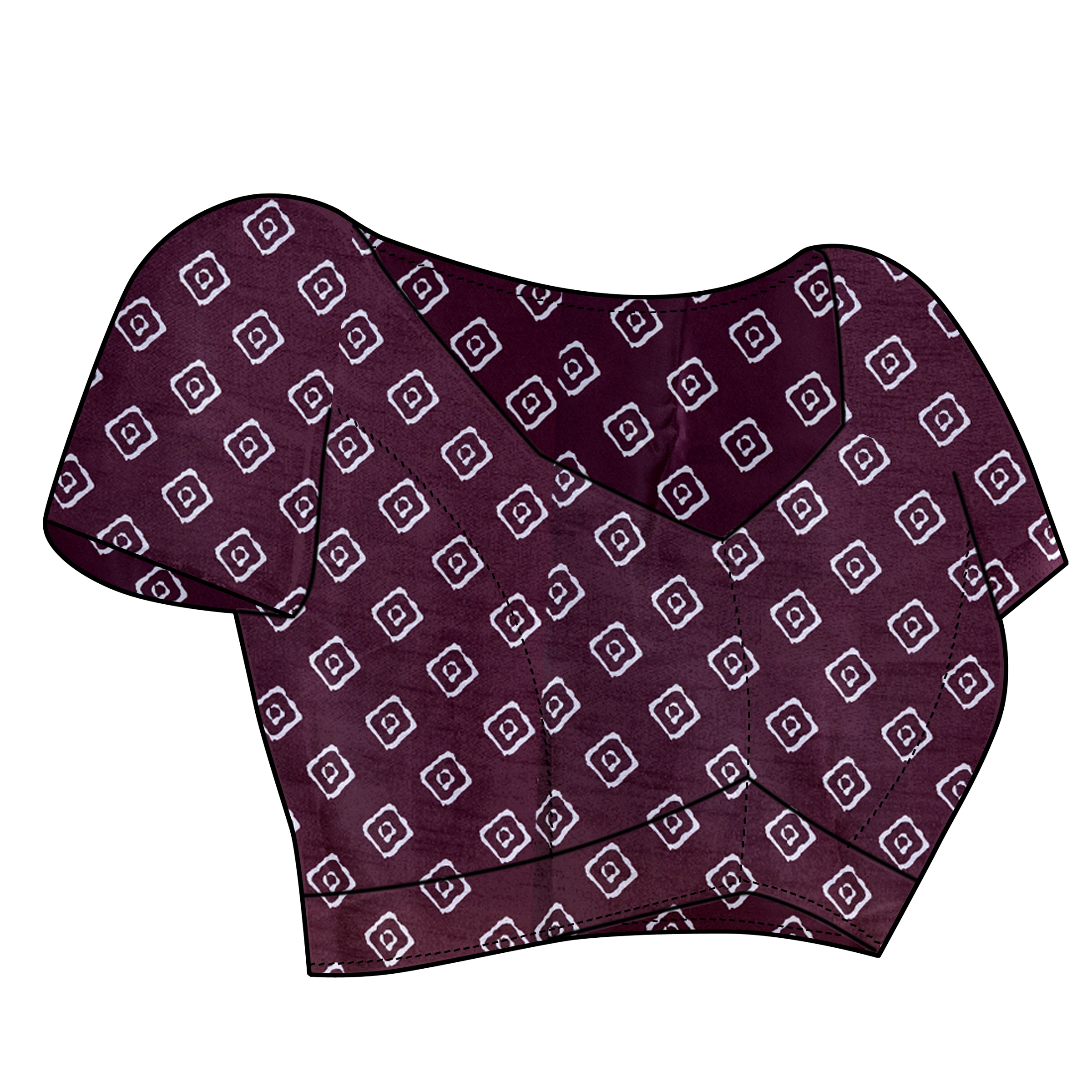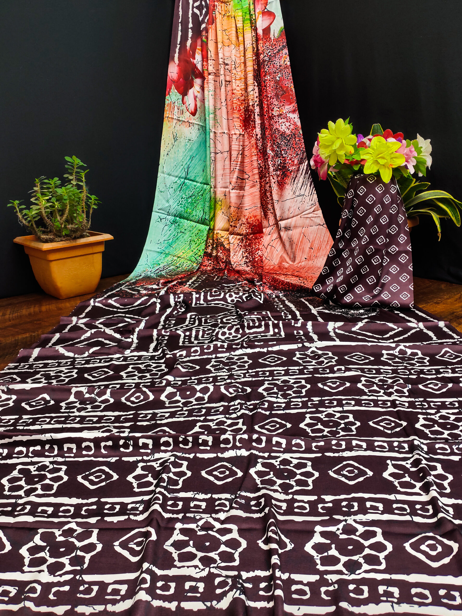 This Japanese crape saree features a captivating contrast of dark brown with white batik-style geometric and floral patterns on the lower half, while the upper portion transitions into an abstract blend of red, pink, green, and yellow hues; it is complemented by a matching dark brown blouse with white diamond-shaped motifs. It is made from a soft and breathable fabric, the saree offers a smooth flow and elegant drape, ensuring a graceful and comfortable wear.
