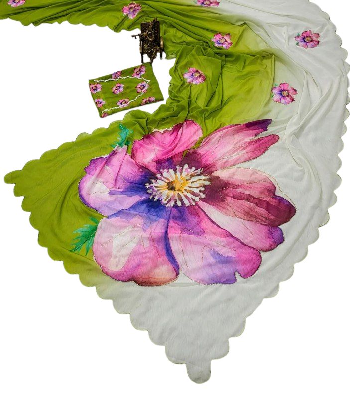 This dual-tone georgette saree in olive green and white is adorned with bold pink floral motifs highlighted with delicate cut dana hand work, paired with a matching printed blouse piece, and flows gracefully with an airy, elegant drape.