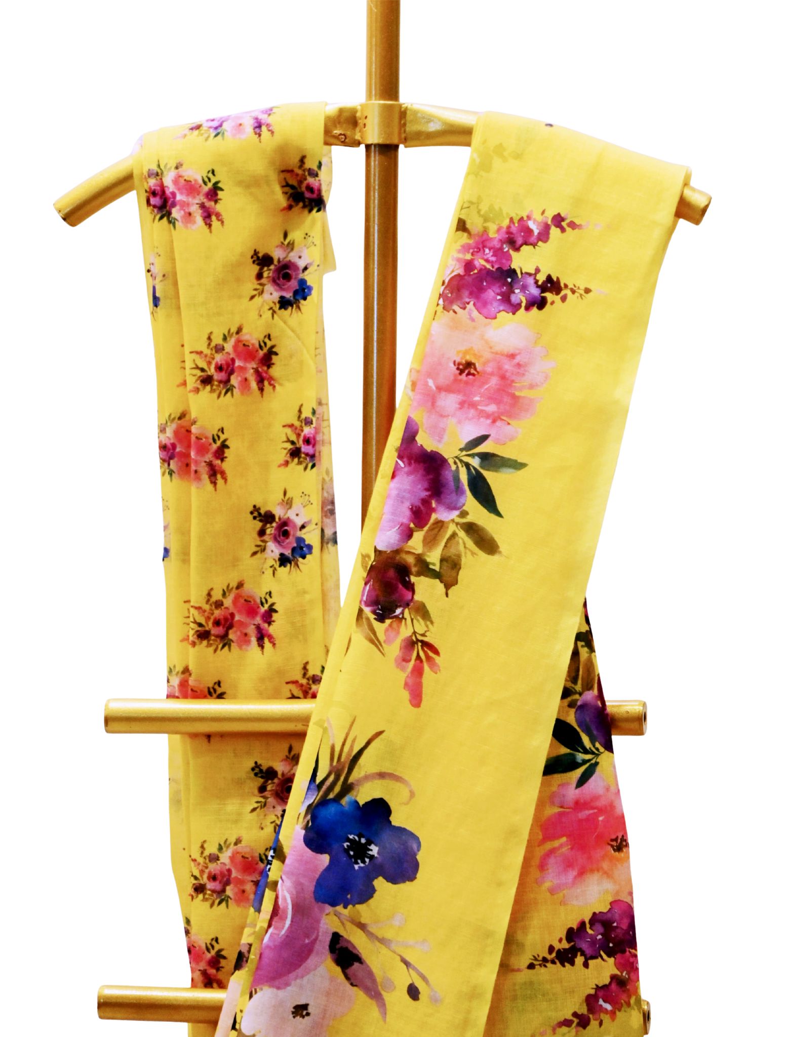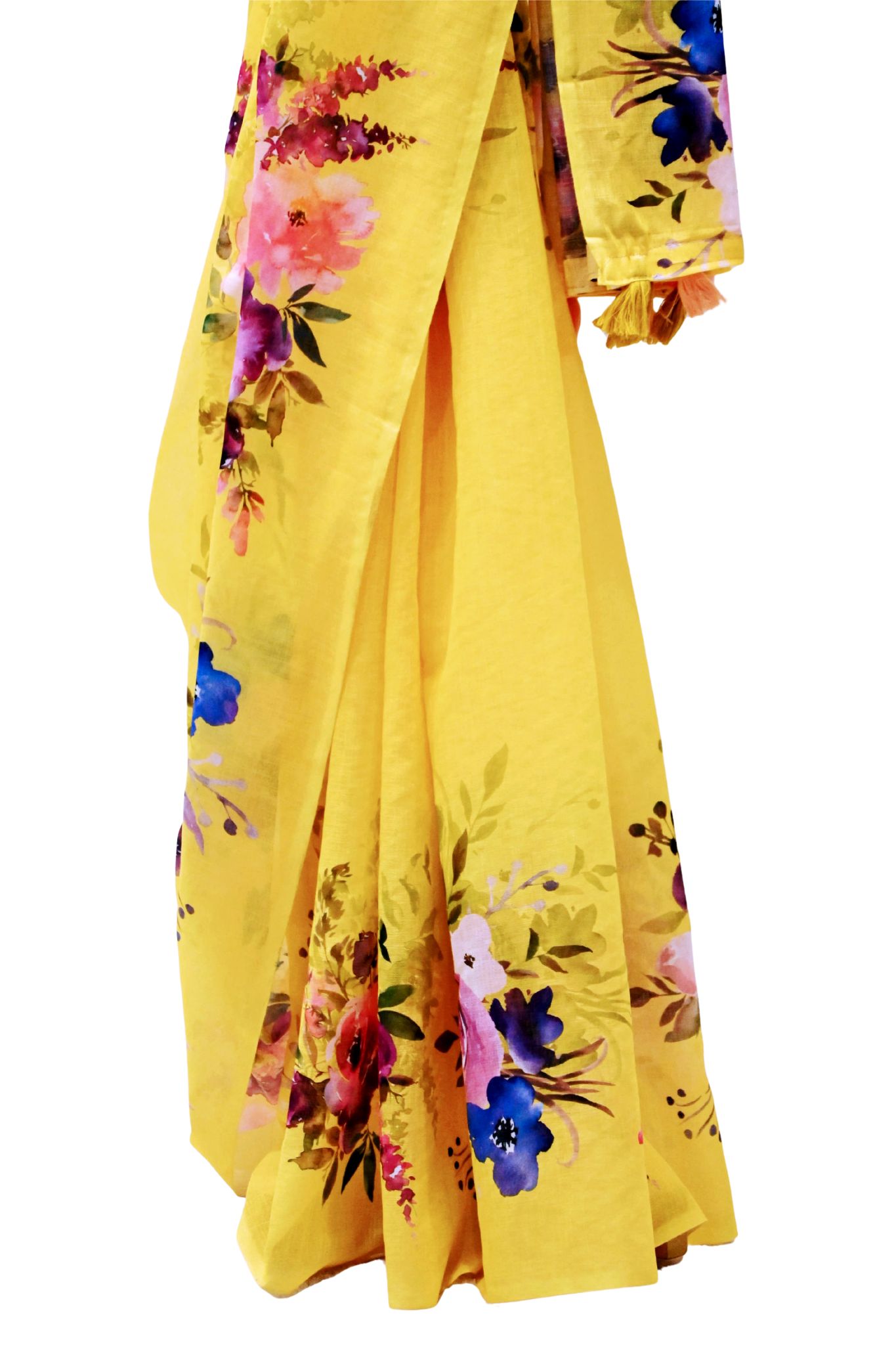 This radiant printed linen cotton saree features a cheerful sunshine yellow base, beautifully adorned with floral prints in shades of pink, purple, blue, and green. The vibrant pallu is richly detailed with clusters of flowers and finished with delicate yellow and orange tassels. It comes with a matching yellow blouse piece to complete the ensemble with elegance and harmony.