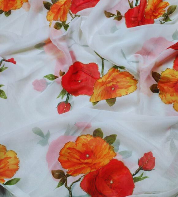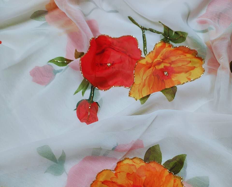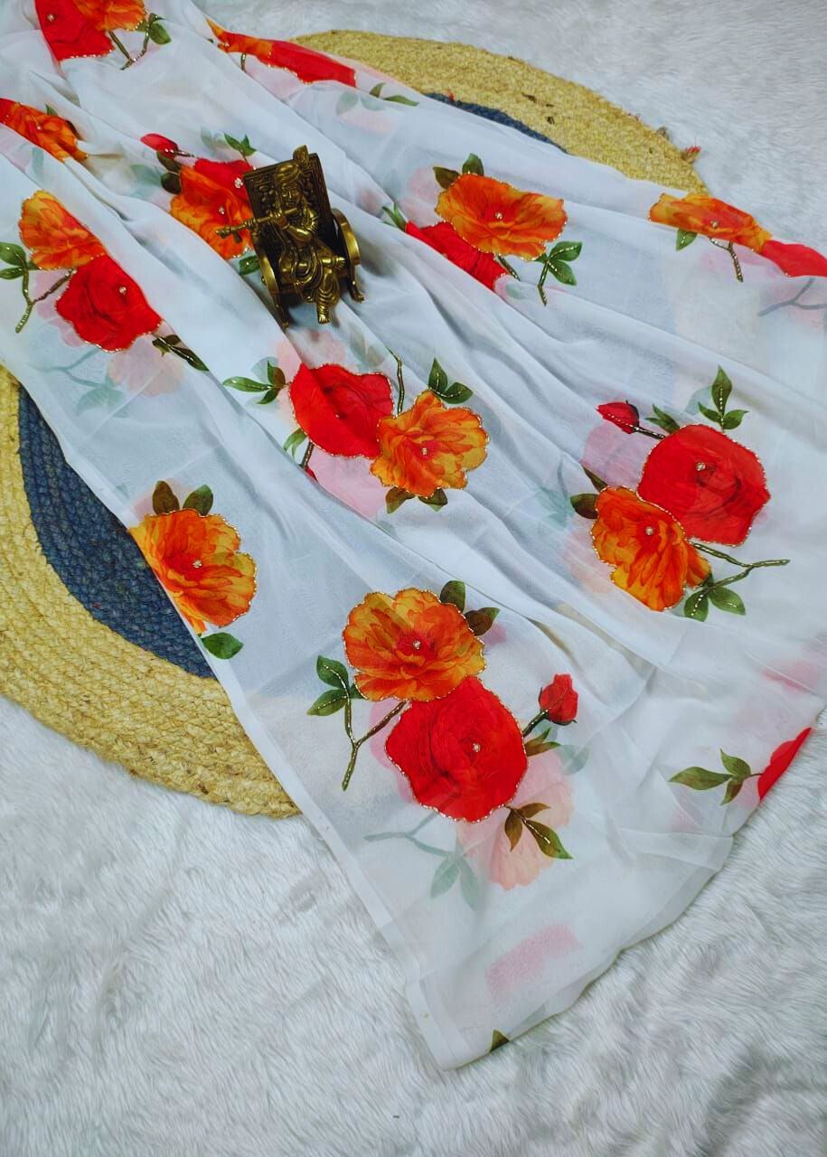 This elegant georgette saree in a white base features delicate cutdana hand work with vibrant red and orange floral patterns, paired with a rich red blouse piece, offering a graceful flow and a perfect blend of freshness and sophistication.