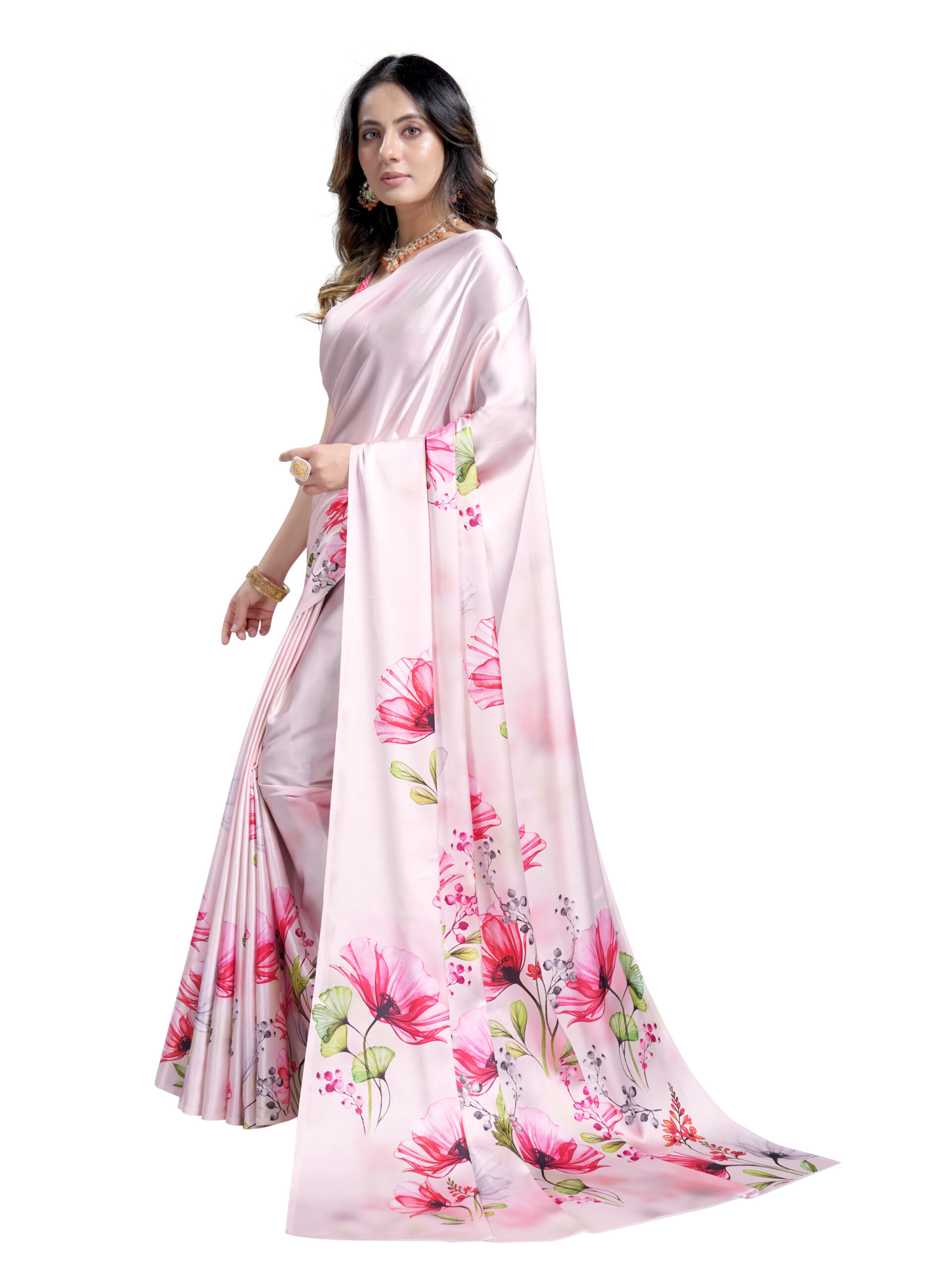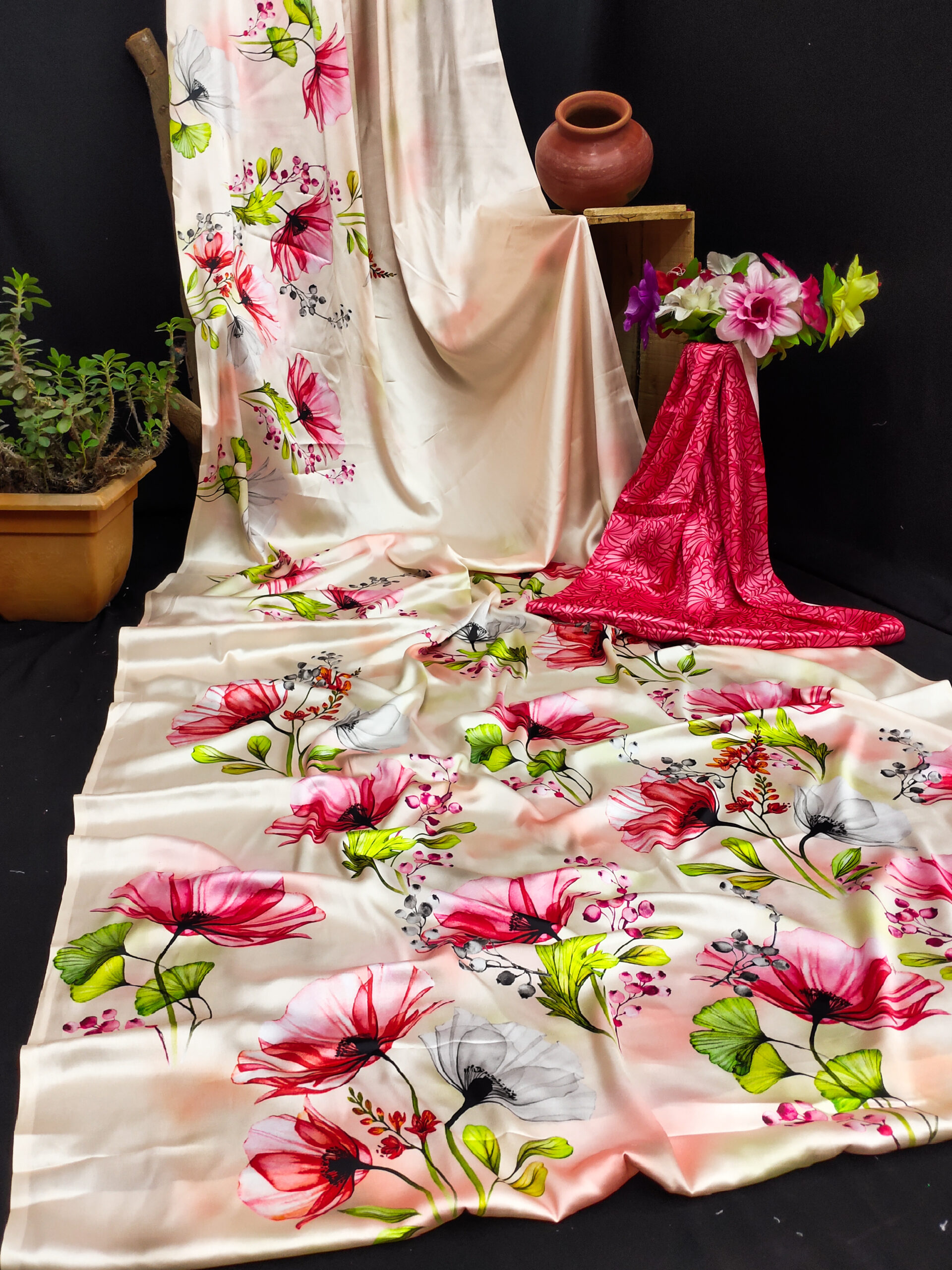 This Japanese crape saree showcases a graceful blend of elegance and vibrancy with its soft cream base, adorned with beautifully detailed floral prints in striking shades of pink, red, white, and fresh green leaves. The delicate watercolor-like gradient effect enhances its dreamy and artistic appeal, making it a perfect choice for both casual and festive occasions. The accompanying blouse fabric in a bold pink hue with intricate leafy patterns adds a stylish contrast, completing the ensemble with a touch of sophistication and charm