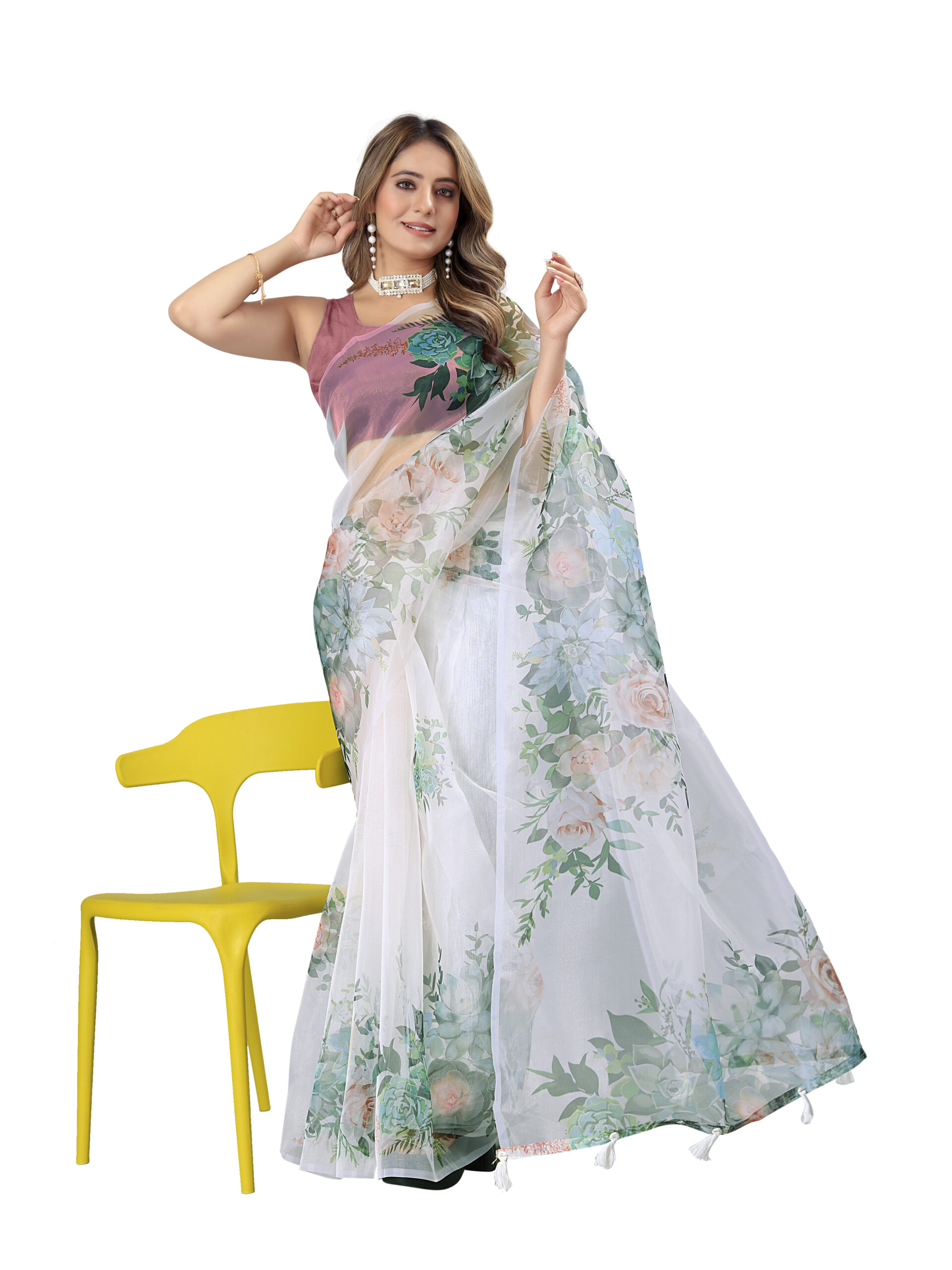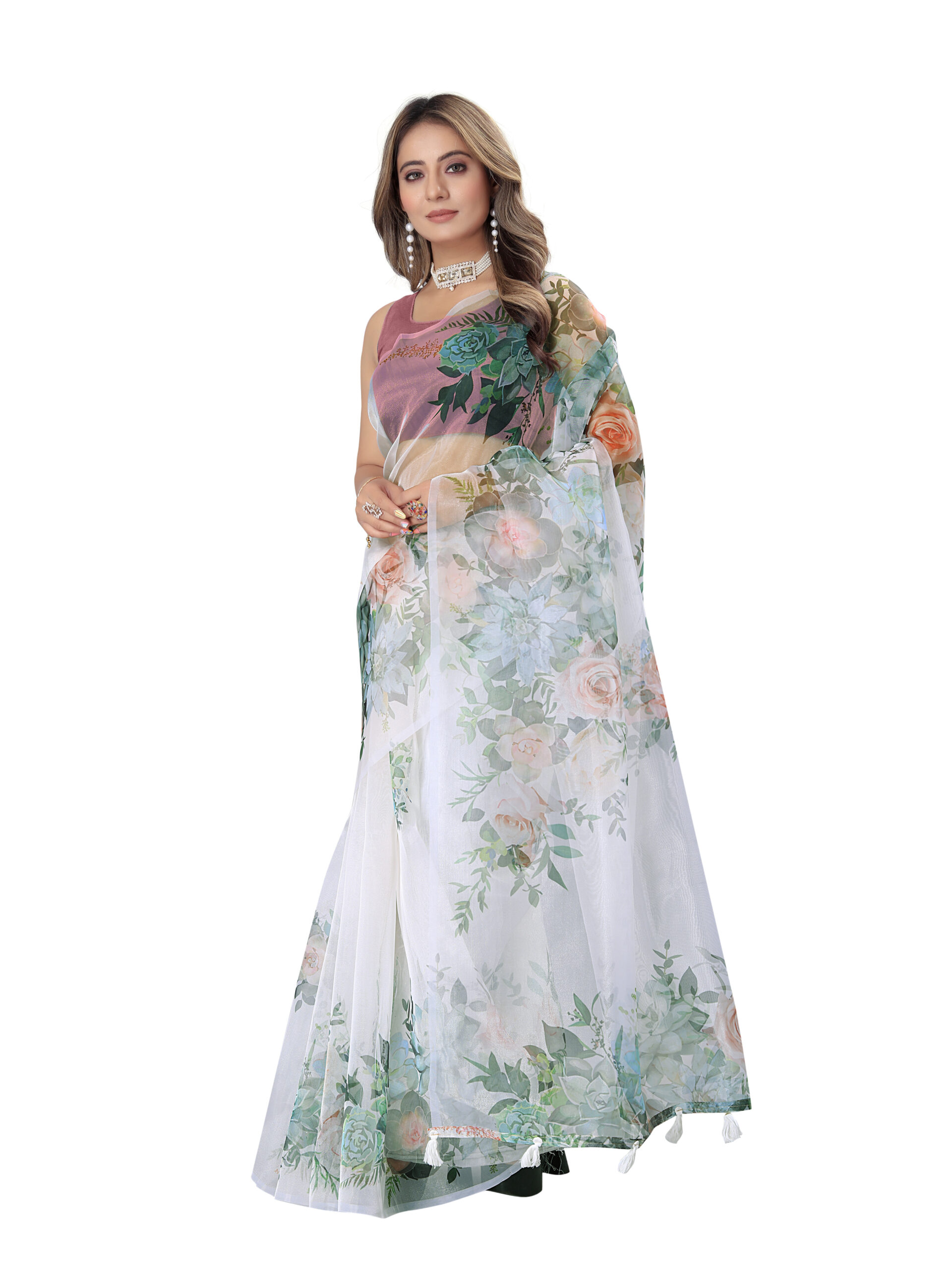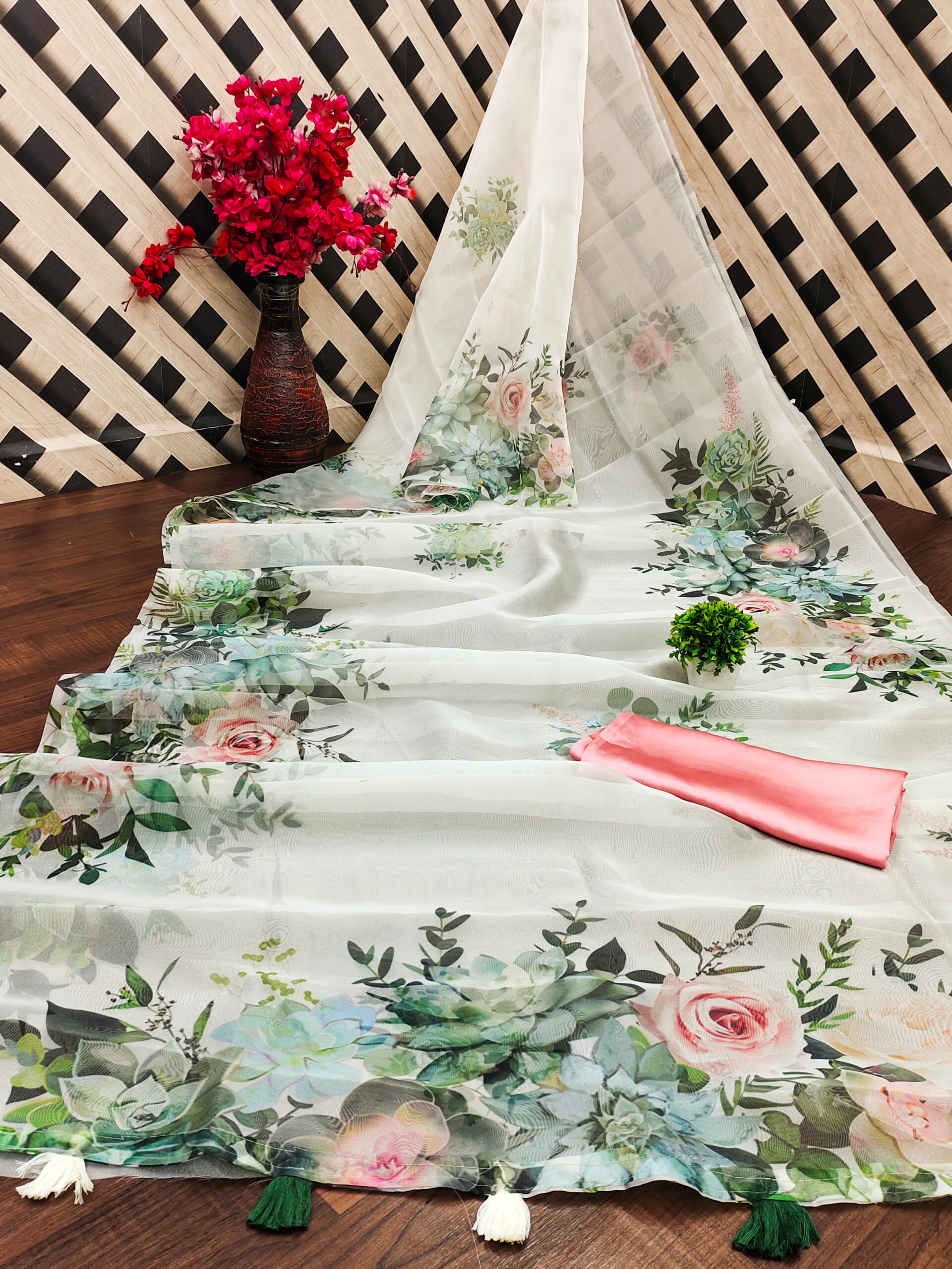 This is a soft organza saree in a delicate off-white or ivory base, adorned with an elegant border of digital floral prints featuring pastel roses and lush green succulents. The dreamy, garden-inspired design is complemented by green and white tassels along the pallu, while the saree comes with a contrasting soft peach-pink blouse piece that adds a gentle pop of color to the overall serene and romantic aesthetic. It is made from a soft and breathable fabric, the saree offers a smooth flow and elegant drape, ensuring a graceful and comfortable wear.