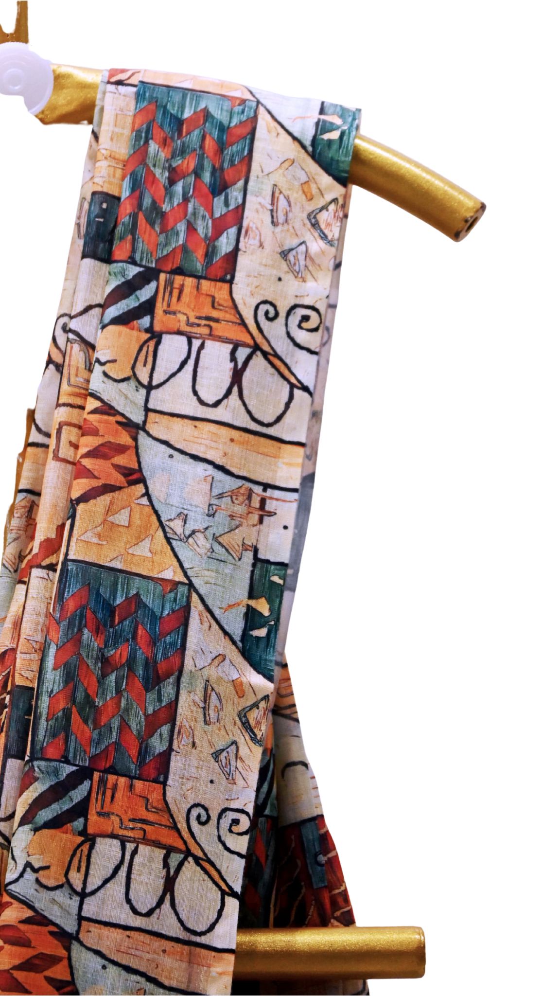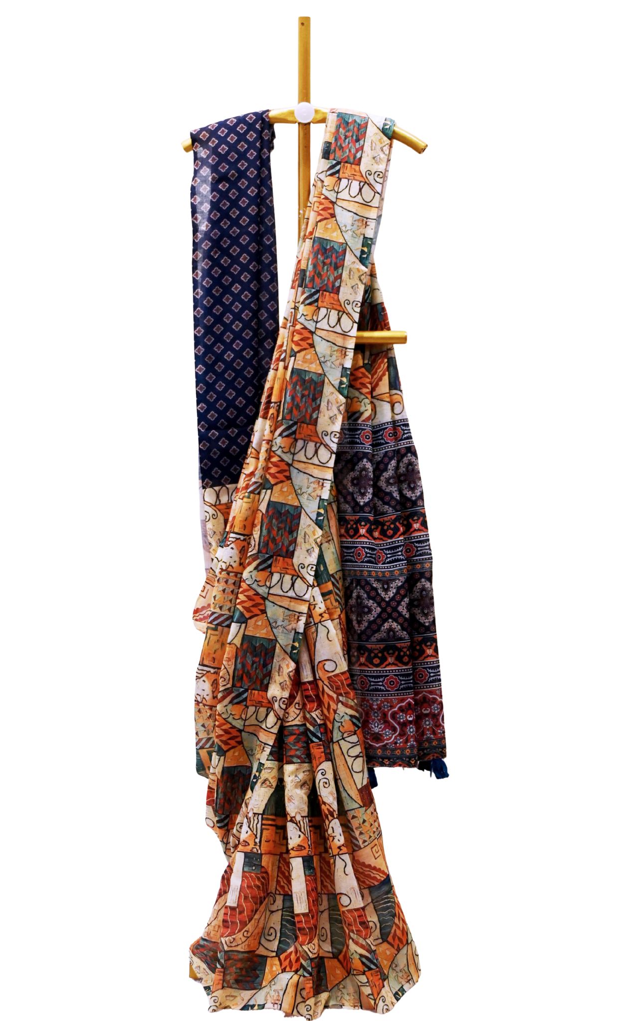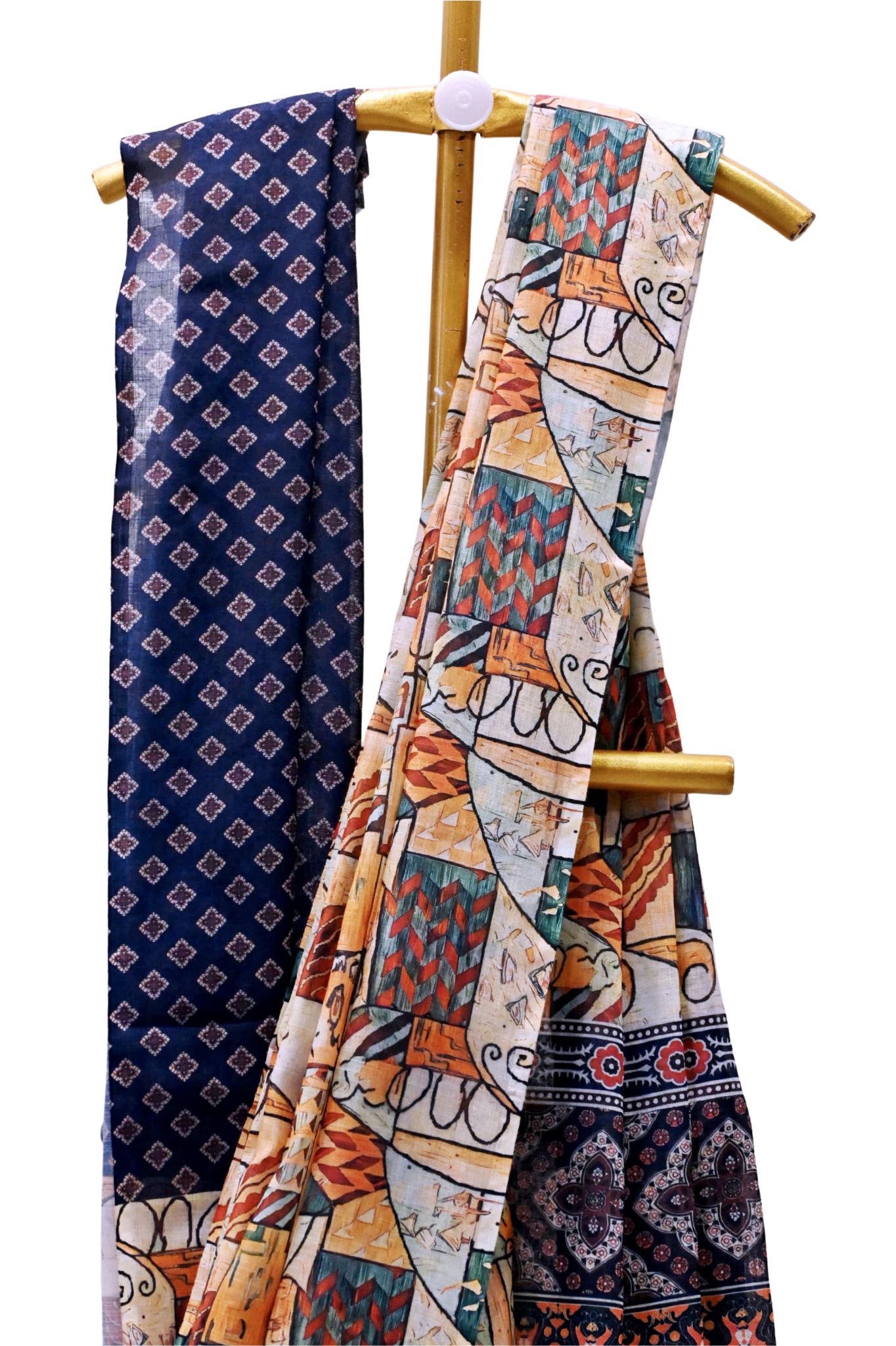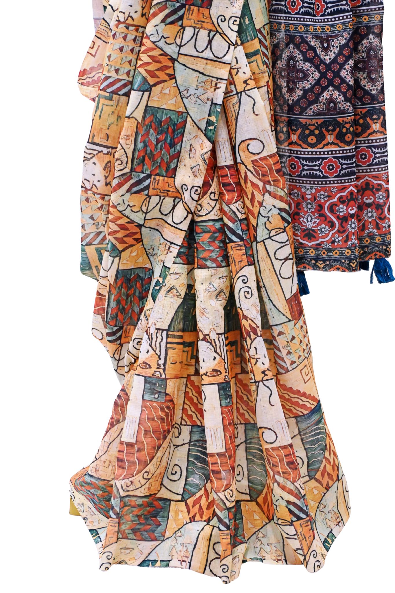 This printed linen cotton saree features a vibrant patchwork-style design in earthy tones of rust, mustard, teal, olive green, and black, giving it a rustic and artistic charm. The saree is lightweight and breathable, ideal for daywear or casual festive occasions. It is paired with a complementing blouse piece in a rich navy blue with geometric prints that balance the boldness of the saree with elegance.