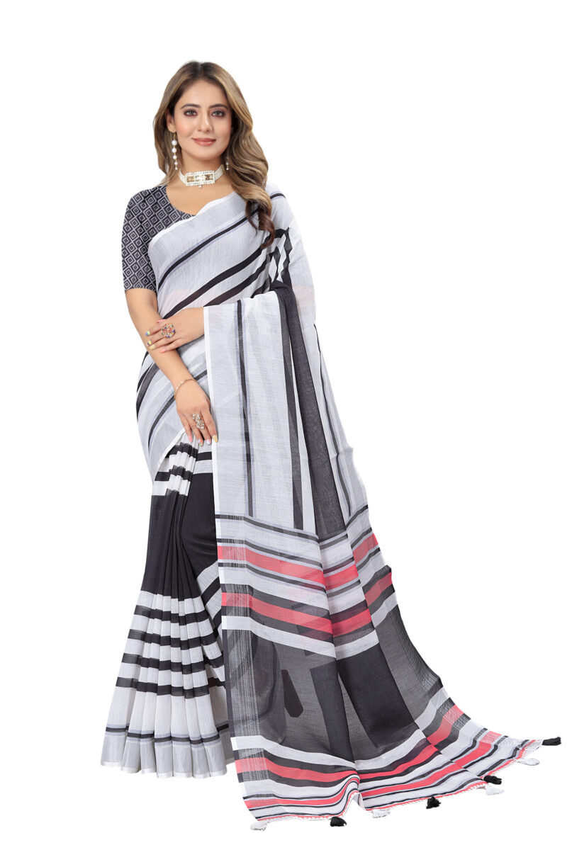 This elegant printed linen cotton saree features a serene white base adorned with vivid peacock patterns and majestic peacock feather motifs in shades of royal blue, teal, pink, and yellow. The contrasting blouse piece showcases bold peacock feather-shaped prints in navy, purple, and red, adding a modern twist to the classic drape. The soft fabric and artistic detailing give it a luxurious, nature-inspired charm.