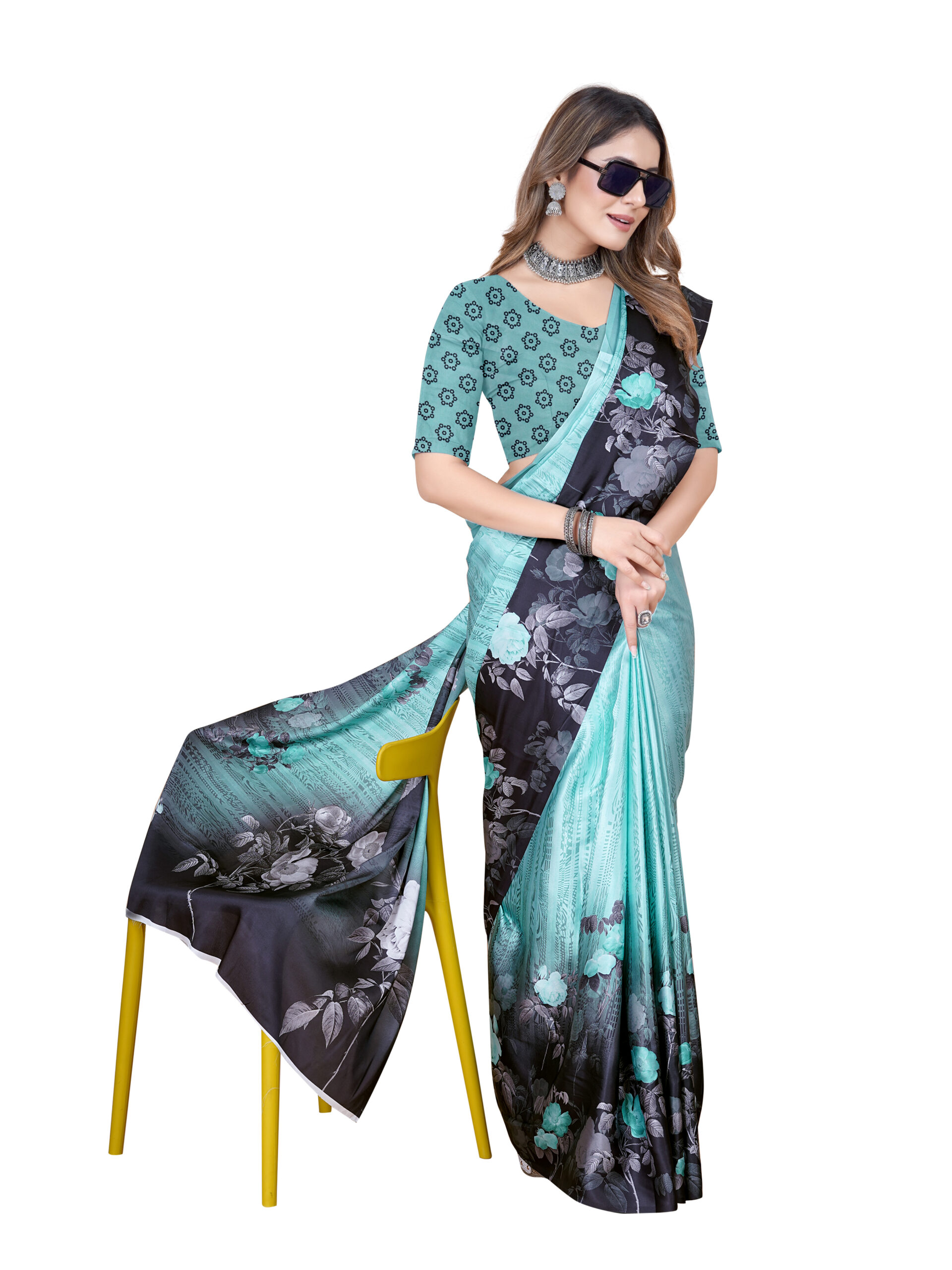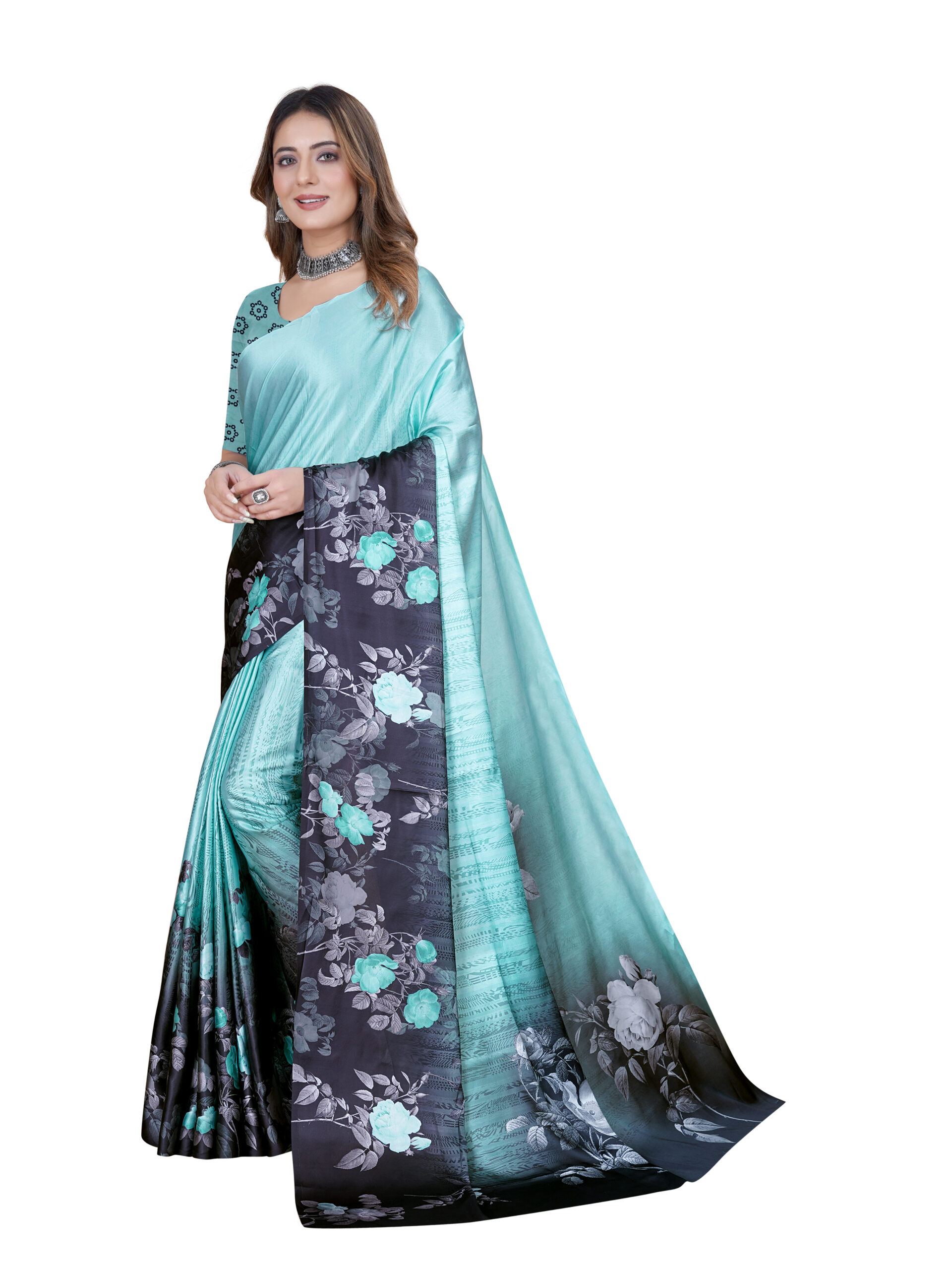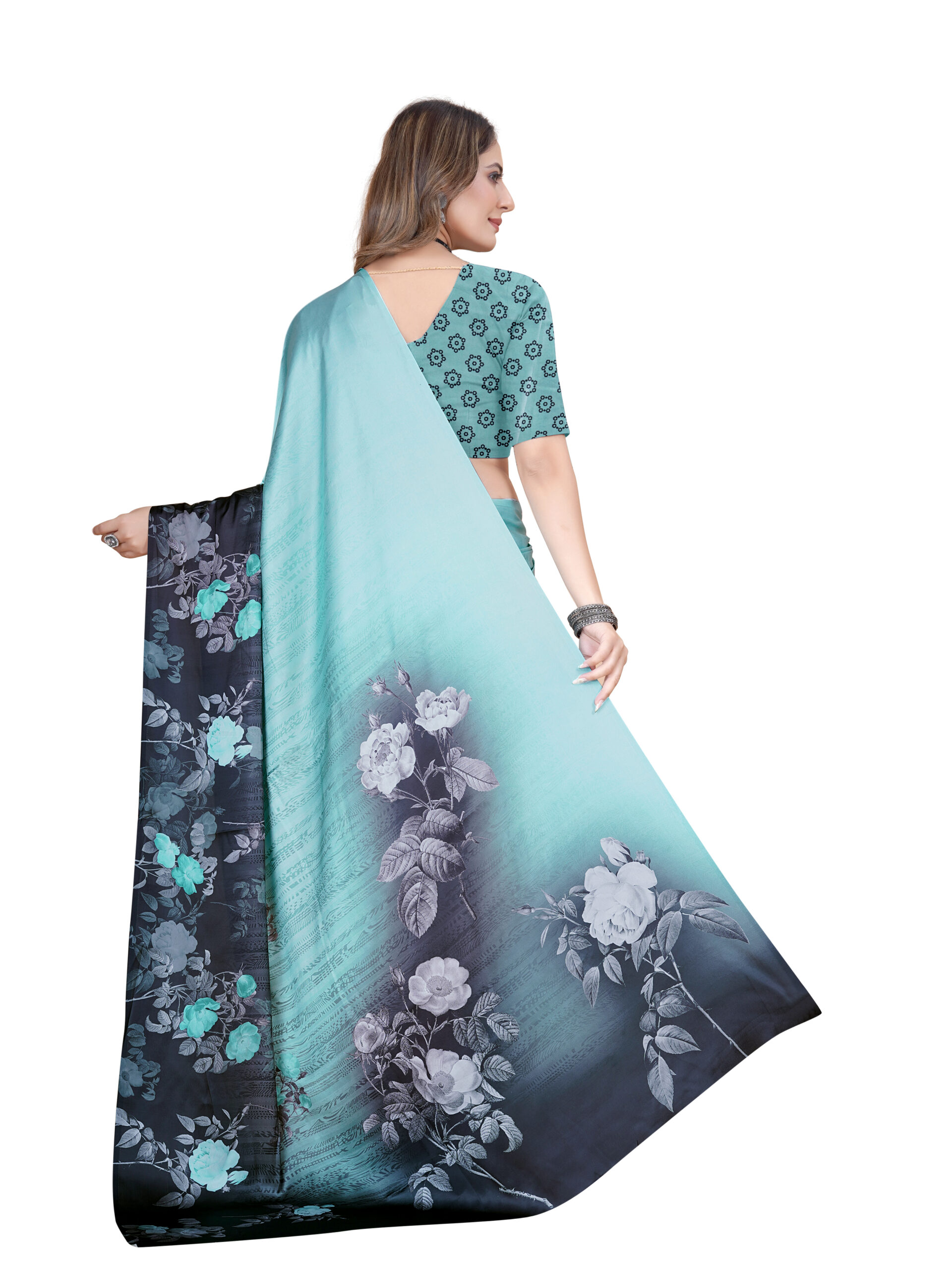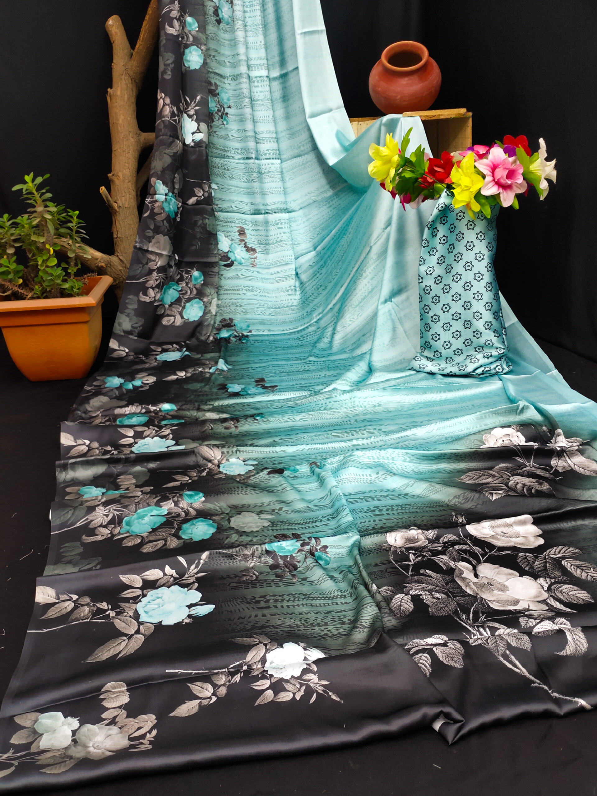 This Japanese crape saree features a striking gradient transition from a serene sky blue to a deep black, adorned with elegant floral patterns in shades of turquoise, white, and gray, while the matching blouse showcases a delicate geometric floral print on a complementary blue base for a sophisticated and modern appeal. It is made from a soft and breathable fabric, the saree offers a smooth flow and elegant drape, ensuring a graceful and comfortable wear, perfect for casual, semi-formal events.
