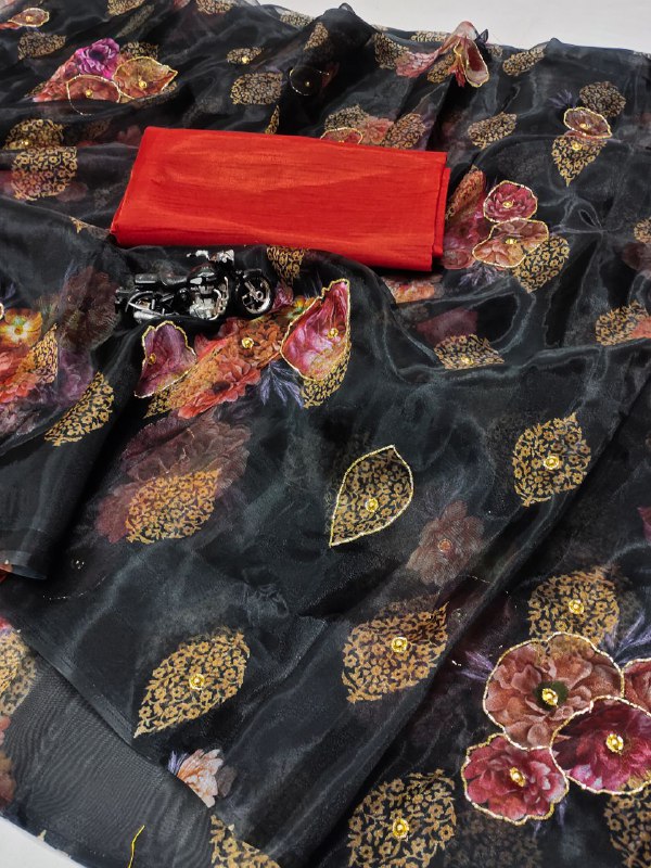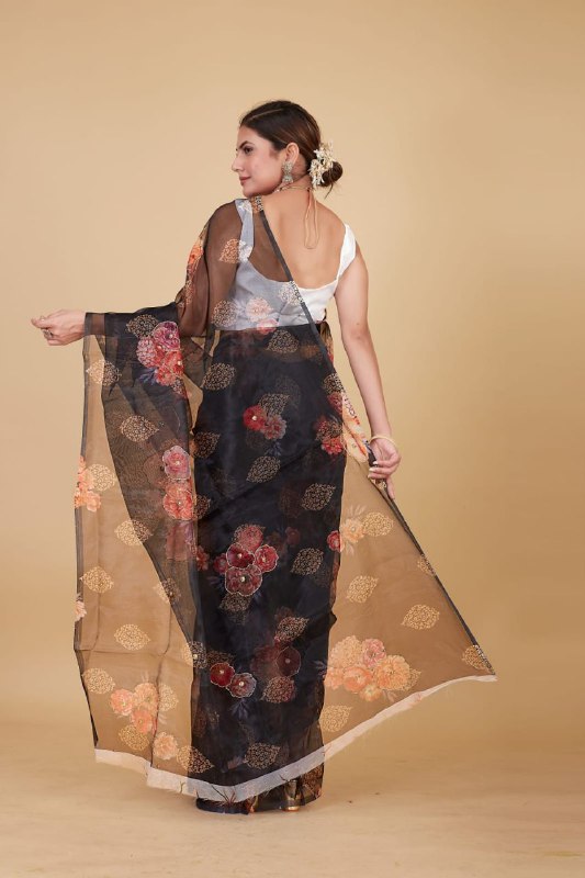 This is a soft black organza saree adorned with intricate cut dana hand work and rich floral patterns in red and gold, paired with a white blouse piece, giving it a luxurious, flowy, and regal appeal.