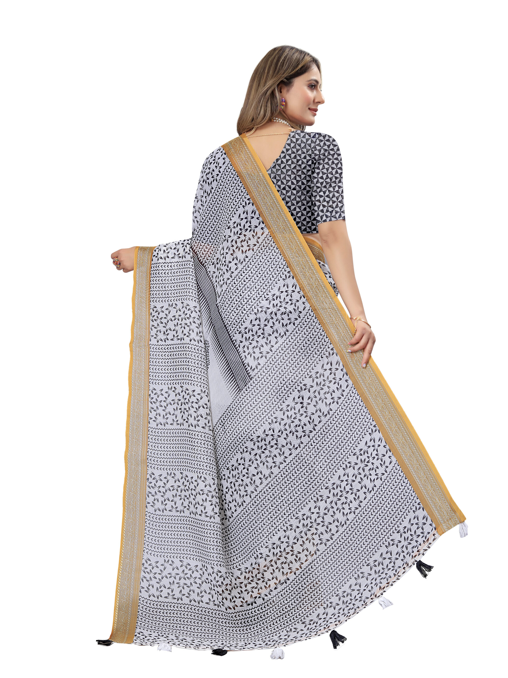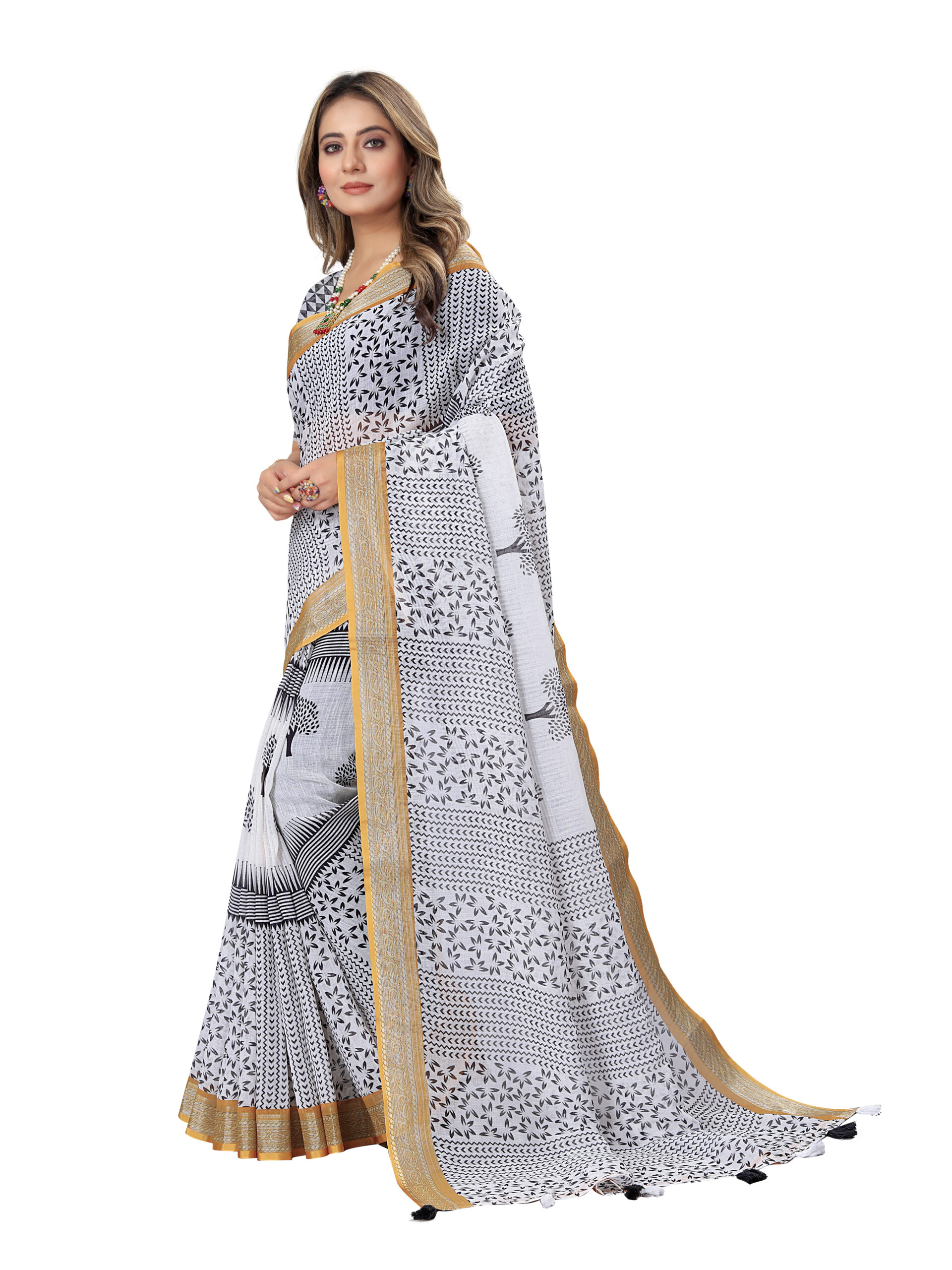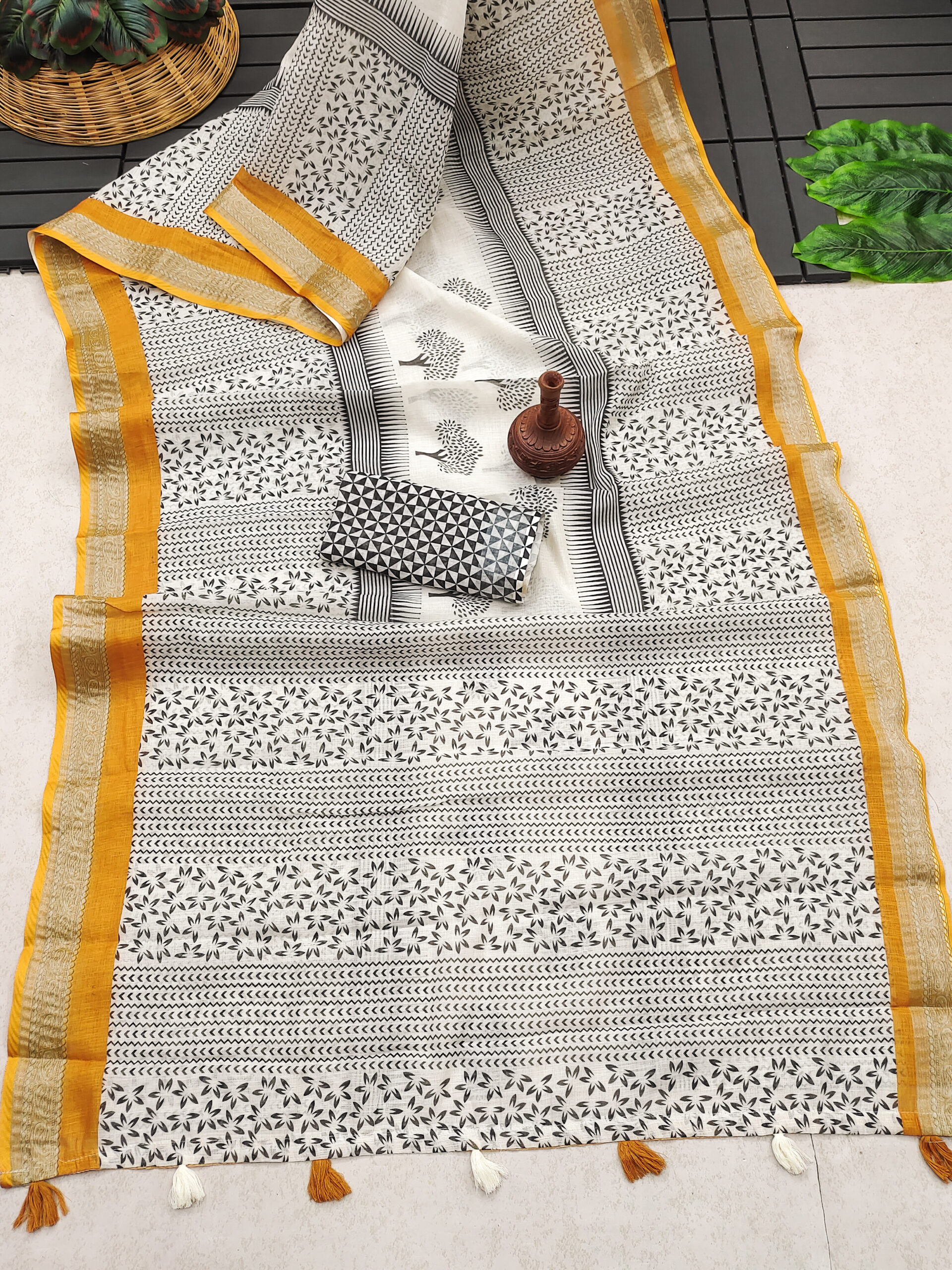 This graceful linen cotton saree with a monochrome black and white pattern, featuring delicate leafy and geometric motifs that create a timeless, elegant look. The pallu showcases a subtle yet artistic touch with black tree prints on a white base, adding an element of nature-inspired sophistication. A golden mustard border with silver detailing beautifully frames the saree, lending a refined contrast that enhances its charm. The accompanying blouse piece complements the saree with a striking black-and-white geometric design, balancing tradition with modern aesthetics. Finished with tassel details along the border, this saree is perfect for casual elegance or cultural gatherings.
