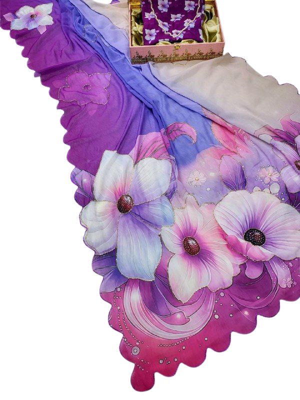 This elegant georgette saree showcases a soothing ombré blend of cream, lavender, and deep purple shades, adorned with large floral prints highlighted by sparkling cut dana hand work, giving it a fluid, graceful drape along with a coordinated floral blouse piece.