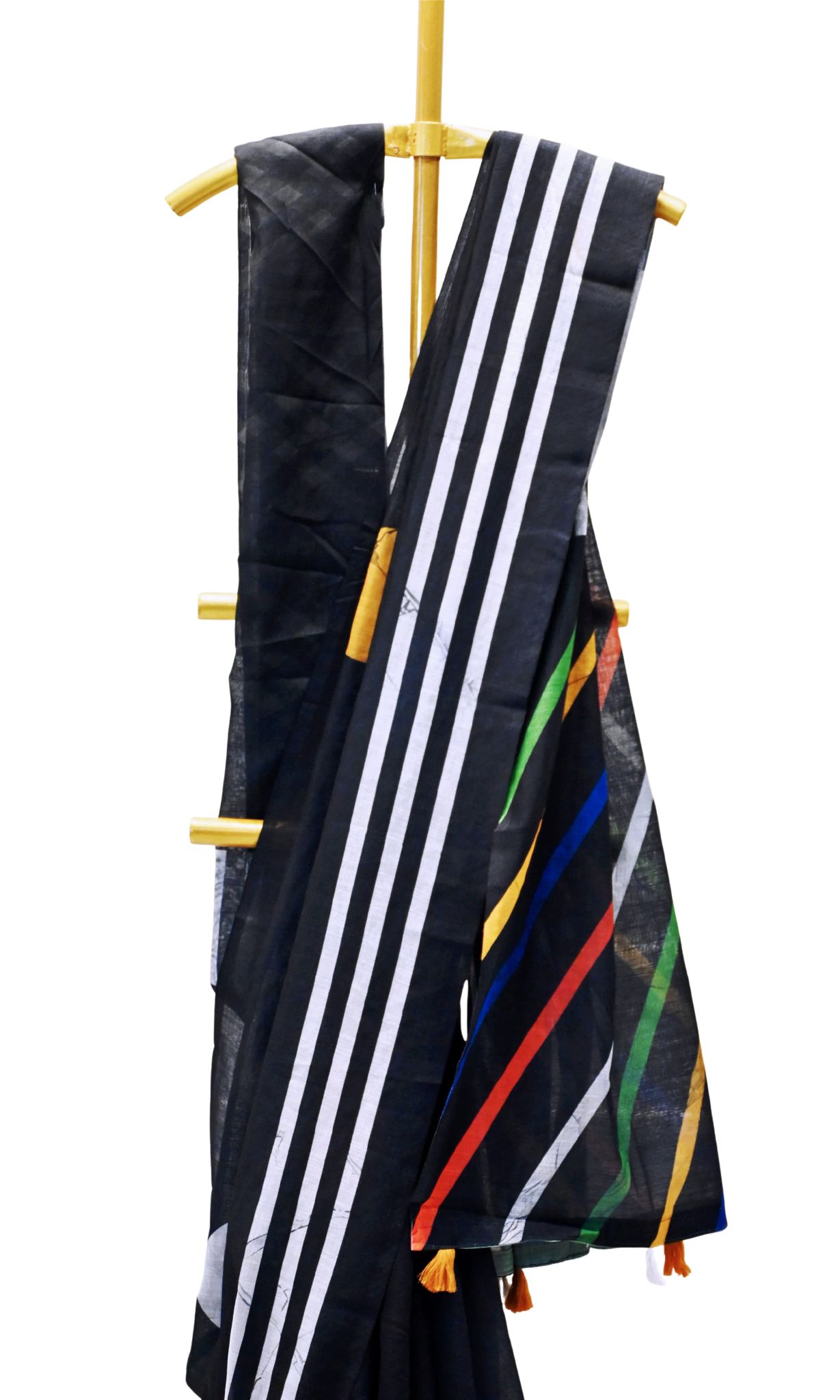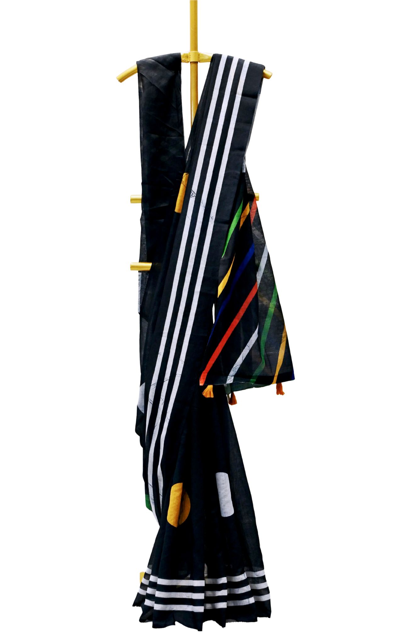 This striking printed linen cotton saree features a jet-black base adorned with bold white stripes and circle motifs in mustard yellow and white across the saree. The pallu makes a bold statement with vivid diagonal stripes in red, green, yellow, blue, and white, finished with playful yellow tassels. It comes with a matching black blouse piece to maintain a balanced yet modern aesthetic.