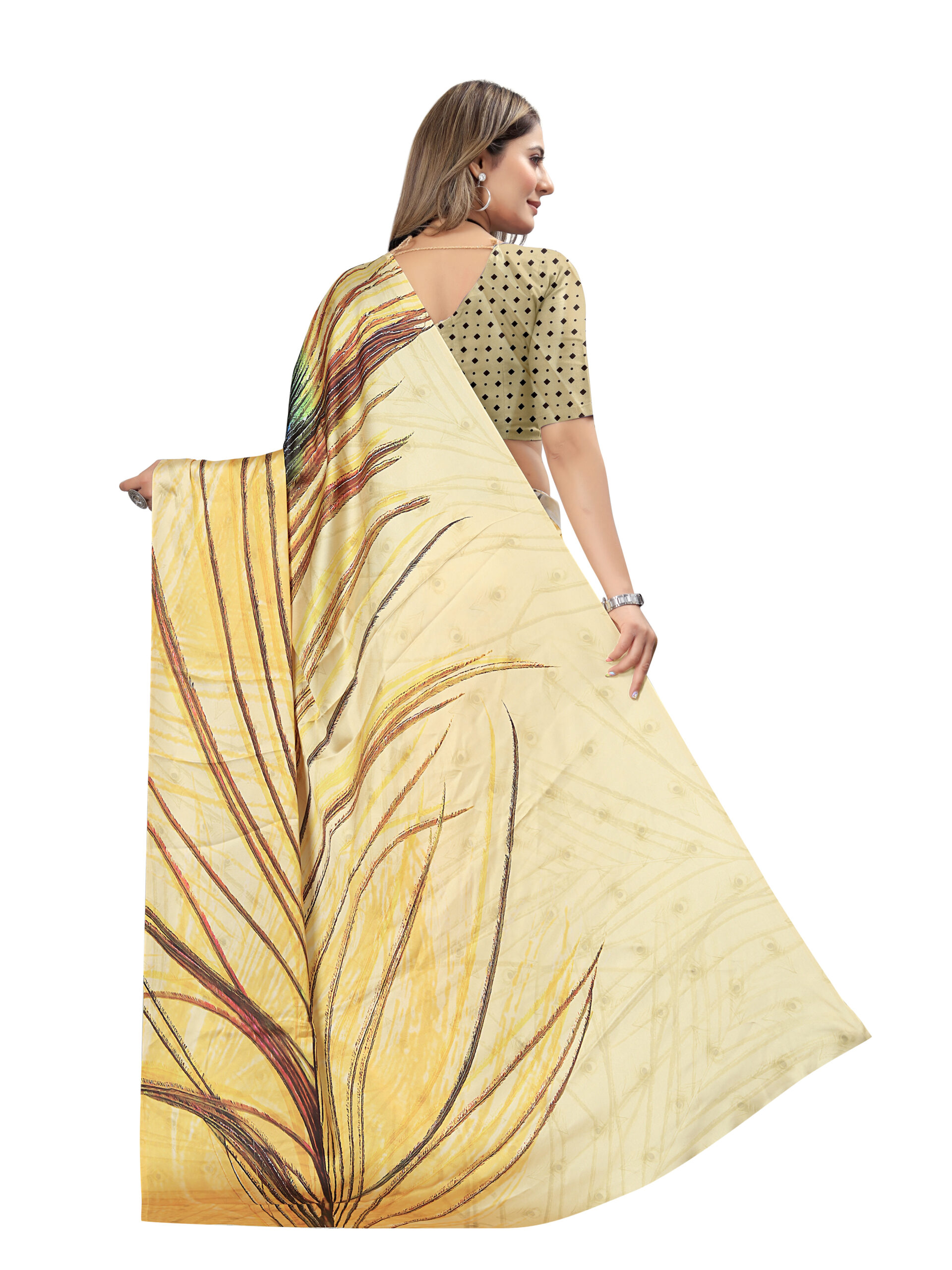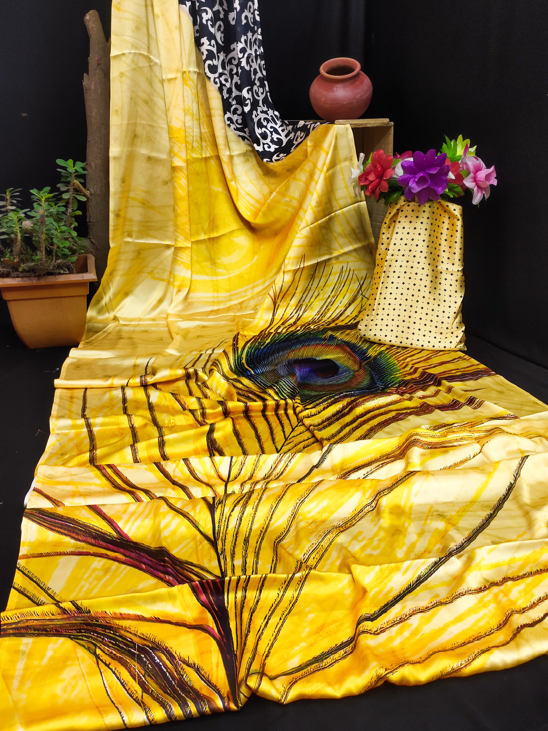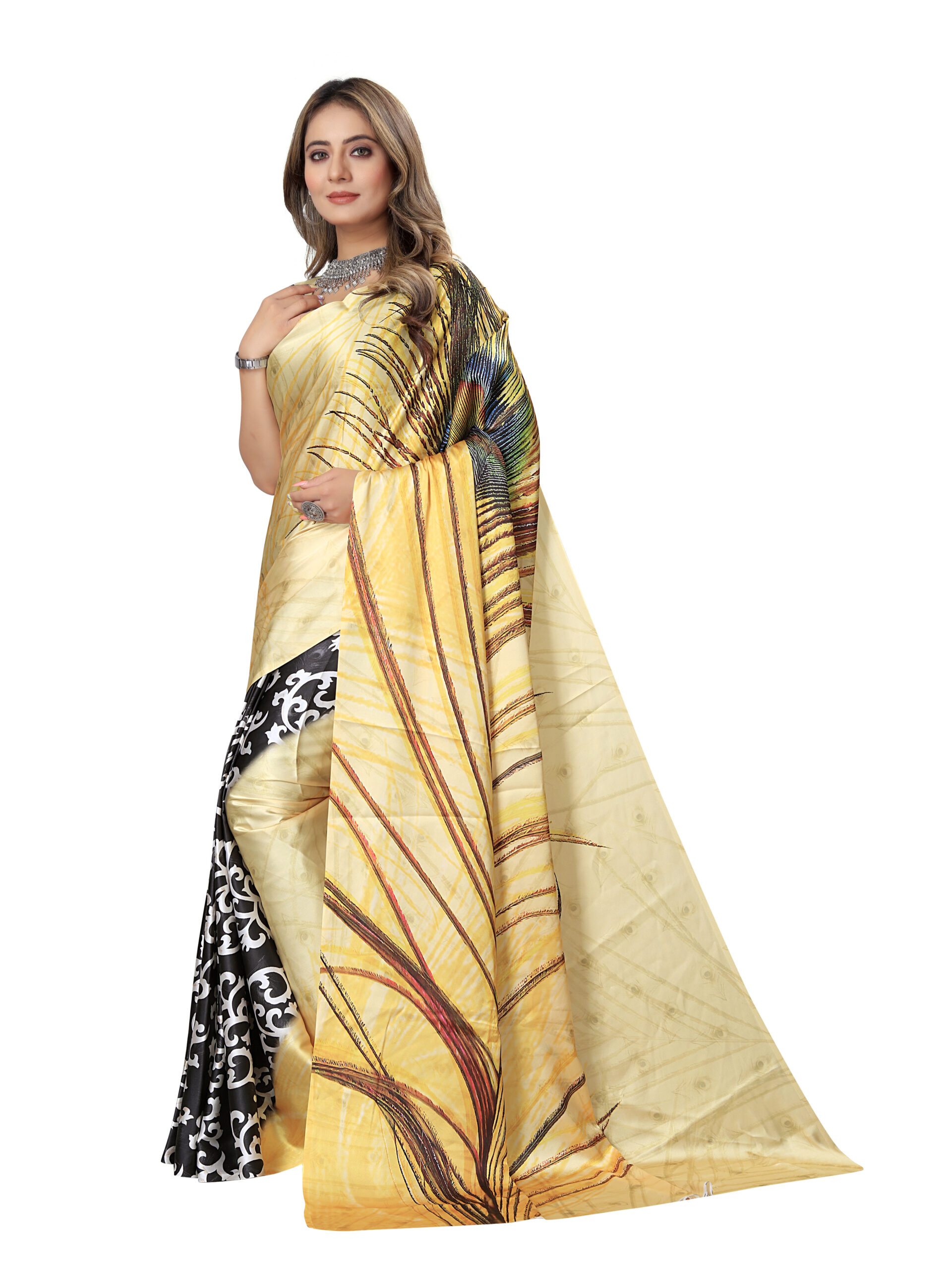 This Japanese crape saree features a two-tone design a soft yellow section with a big peacock feather alongside a black and white printed portion, paired with a coordinating beige blouse that has small black polka dots. It is made from a soft and breathable fabric, the saree offers a smooth flow and elegant drape, ensuring a graceful and comfortable wear, perfect for casual, semi-formal events.
