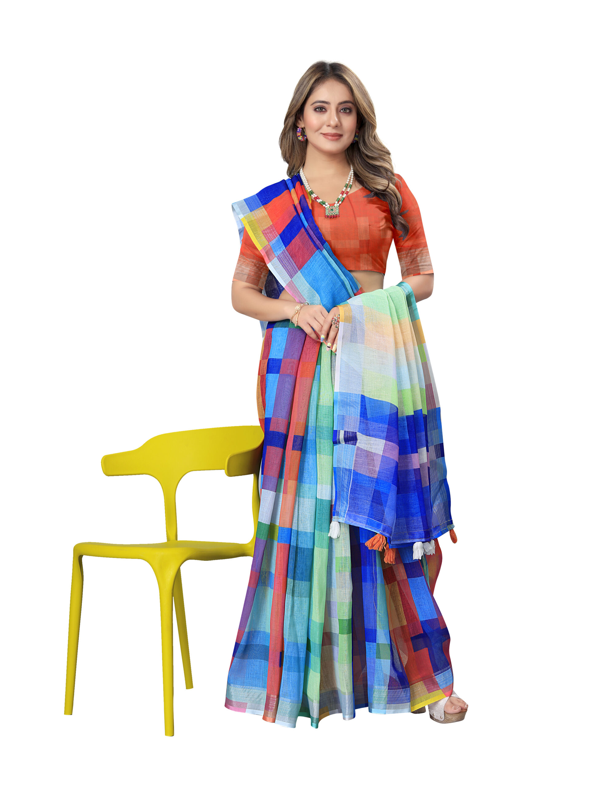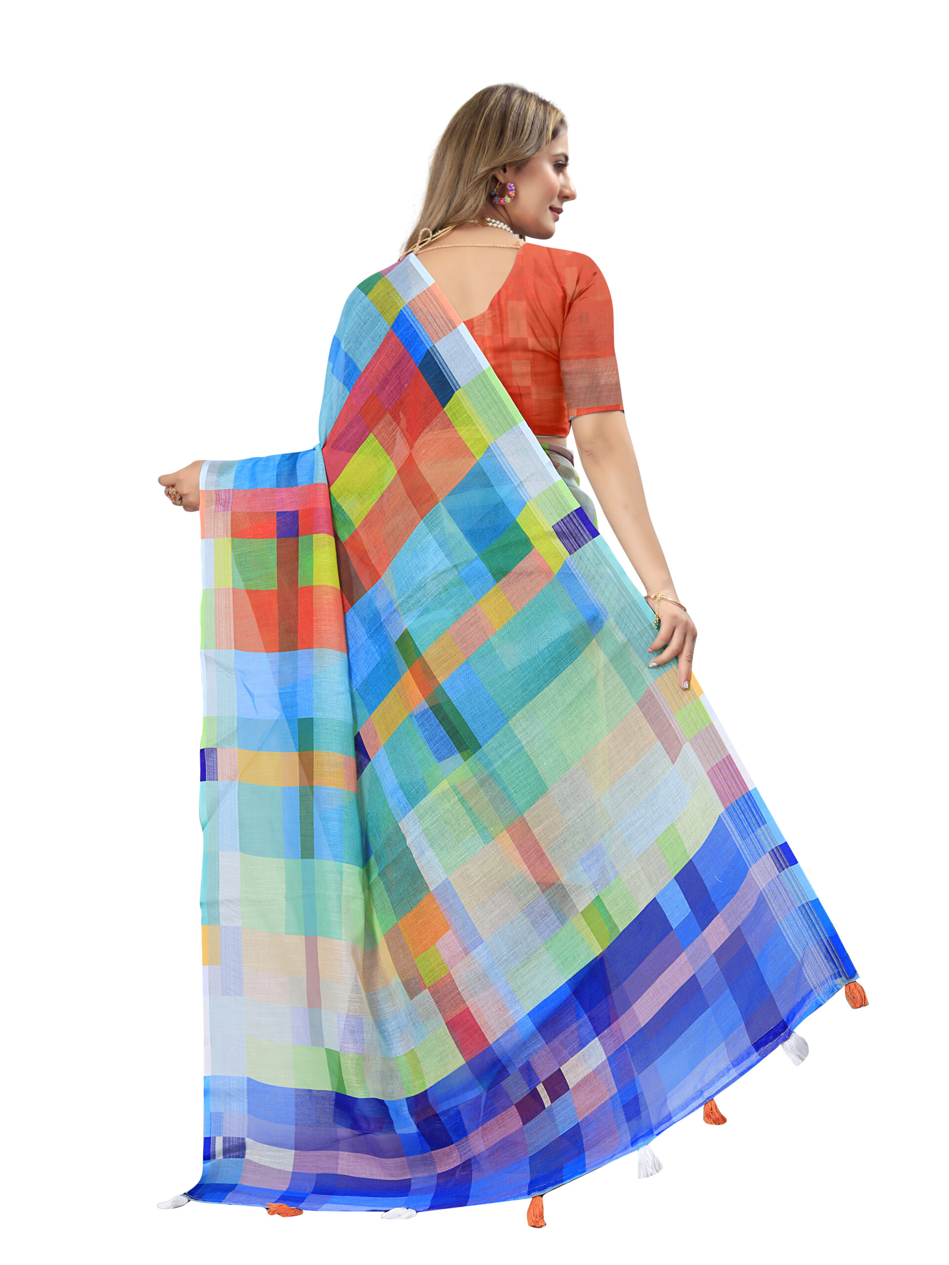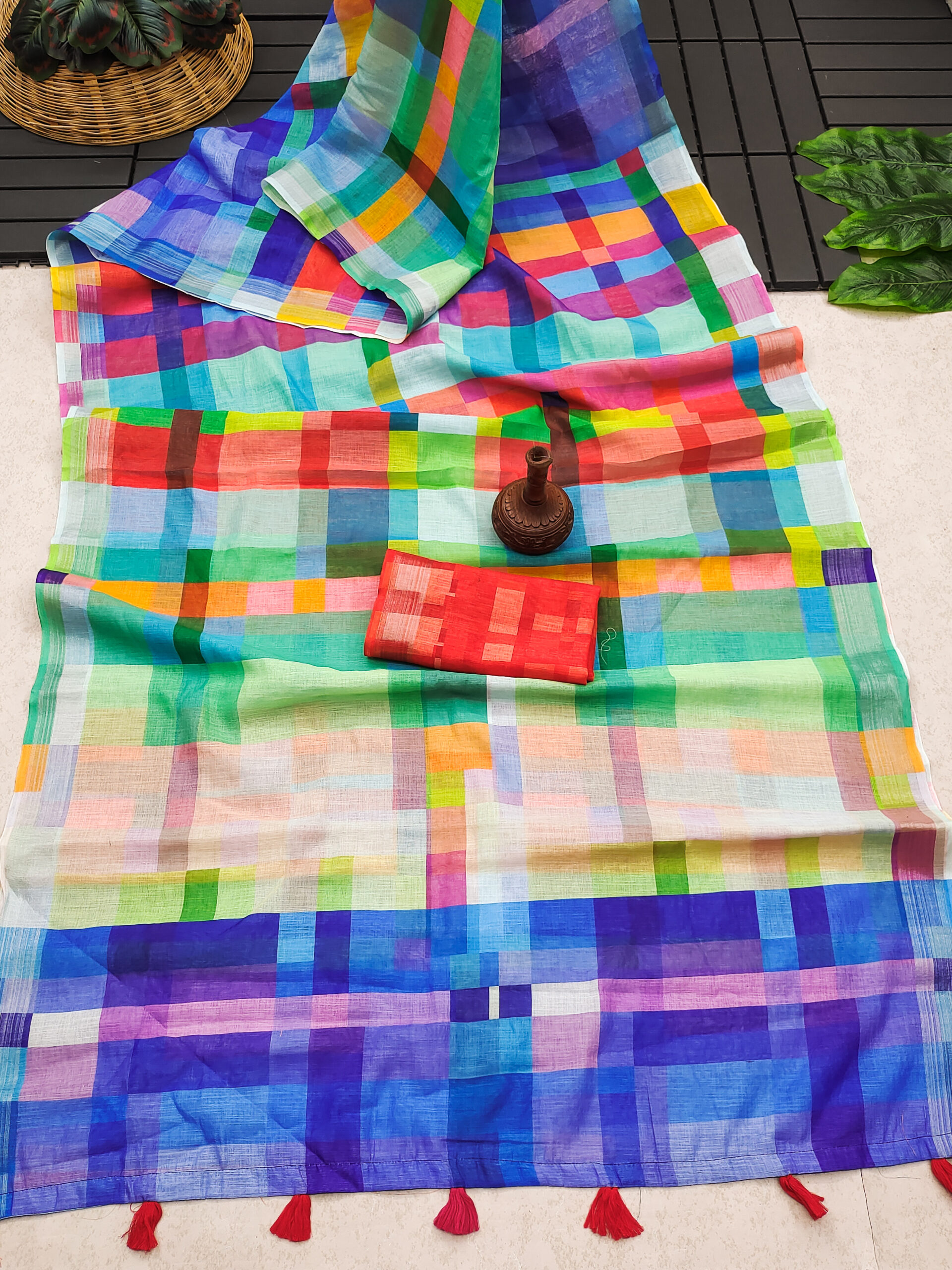 This is a vibrant linen cotton saree featuring a multi-coloured checkered pattern with a beautiful mix of blue, green, red, yellow, and purple hues. The saree is complemented by a contrasting red blouse piece, adding a bold and stylish touch. The elegant tassel detailing on the border enhances its charm, making it a perfect choice. It is made from a soft and breathable fabric, the saree offers a smooth flow and elegant drape, ensuring a graceful and comfortable wear, perfect for casual, semi-formal events.