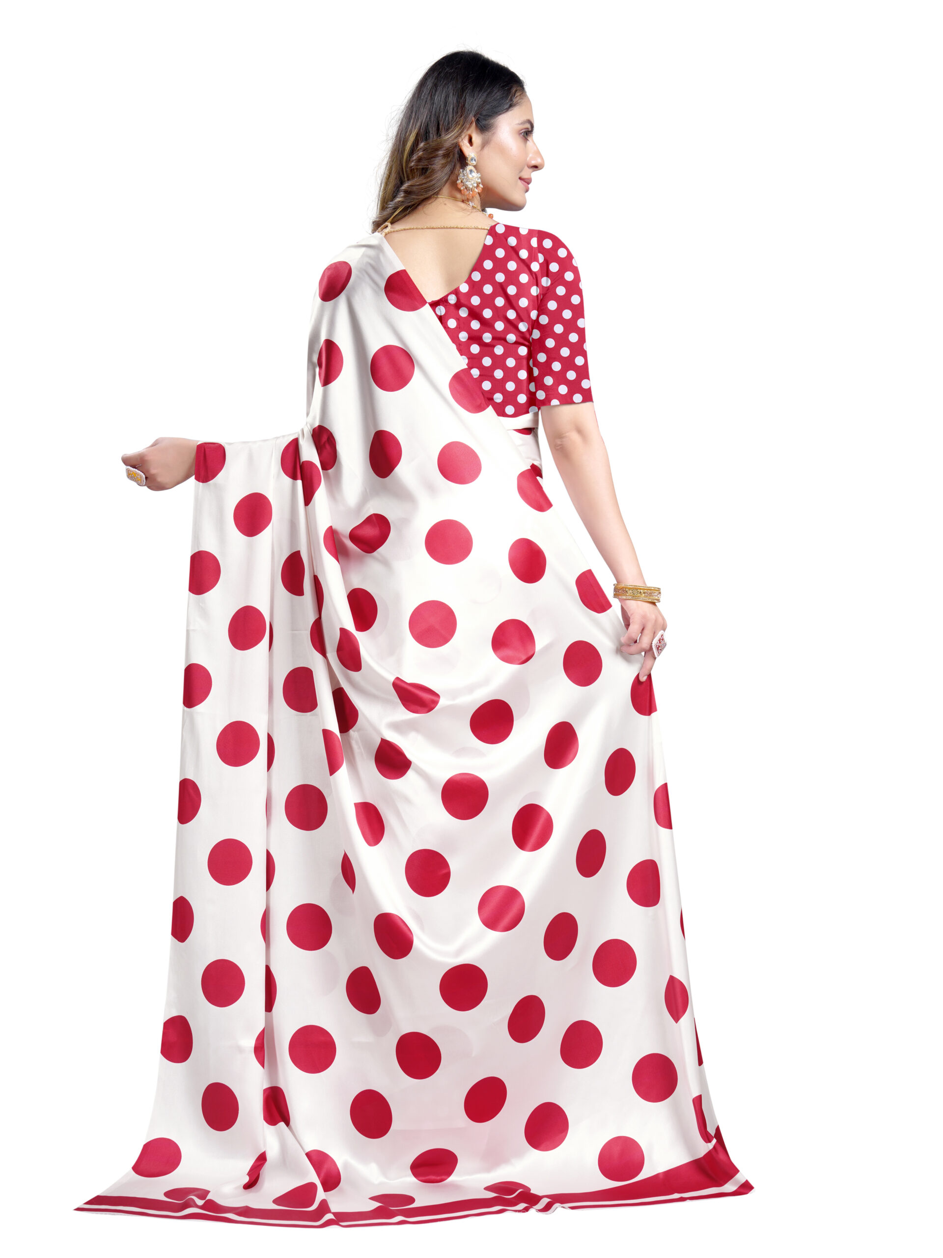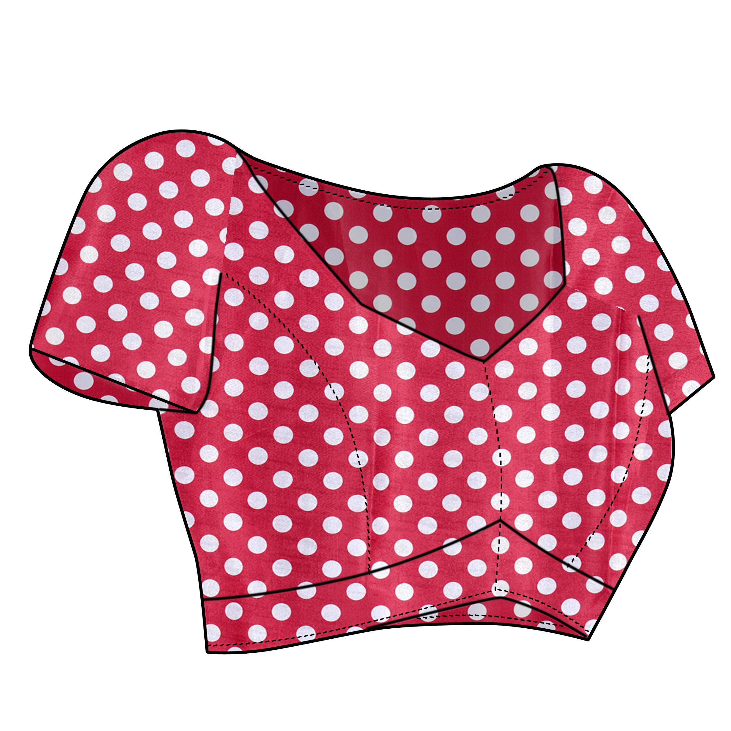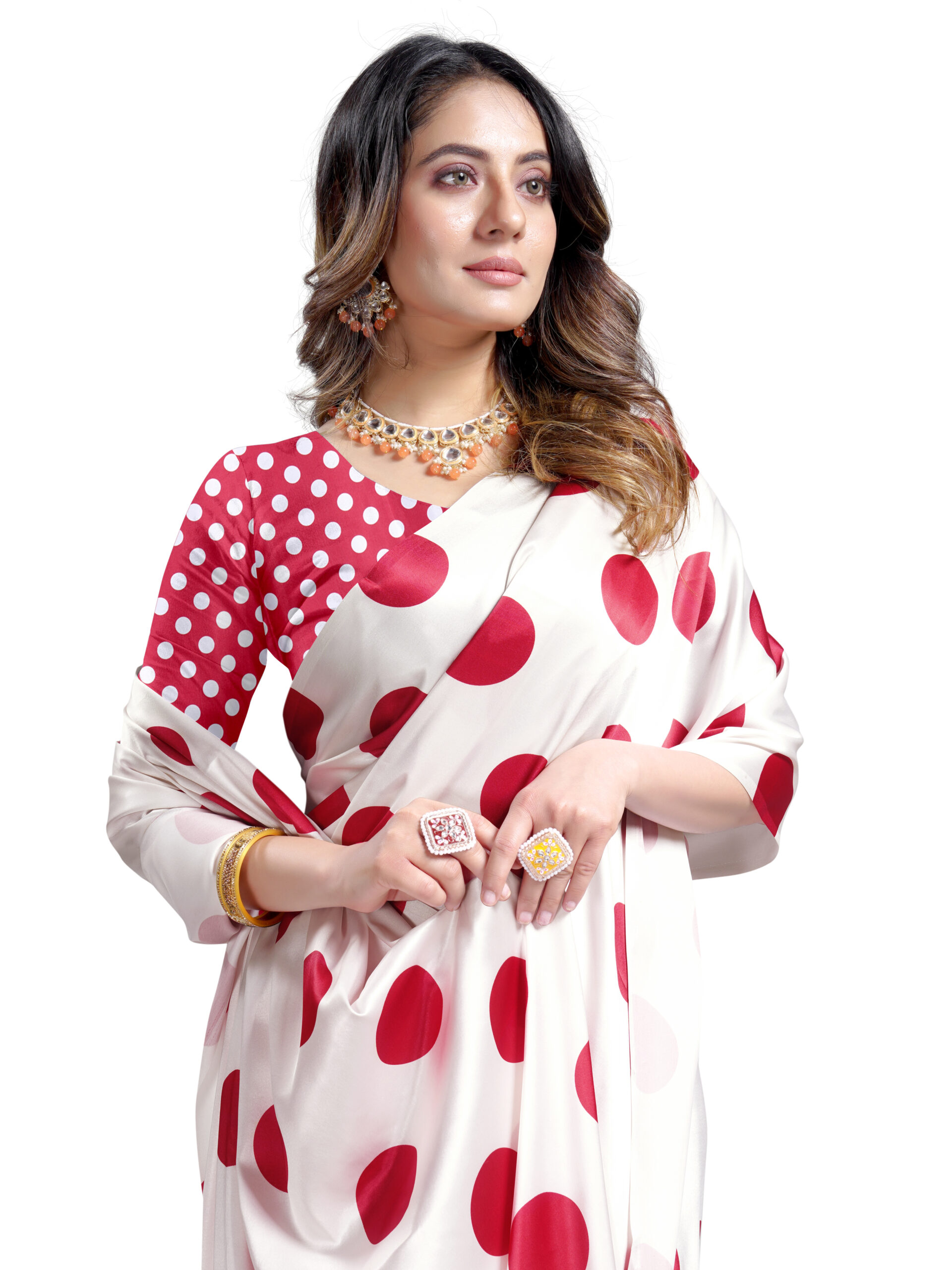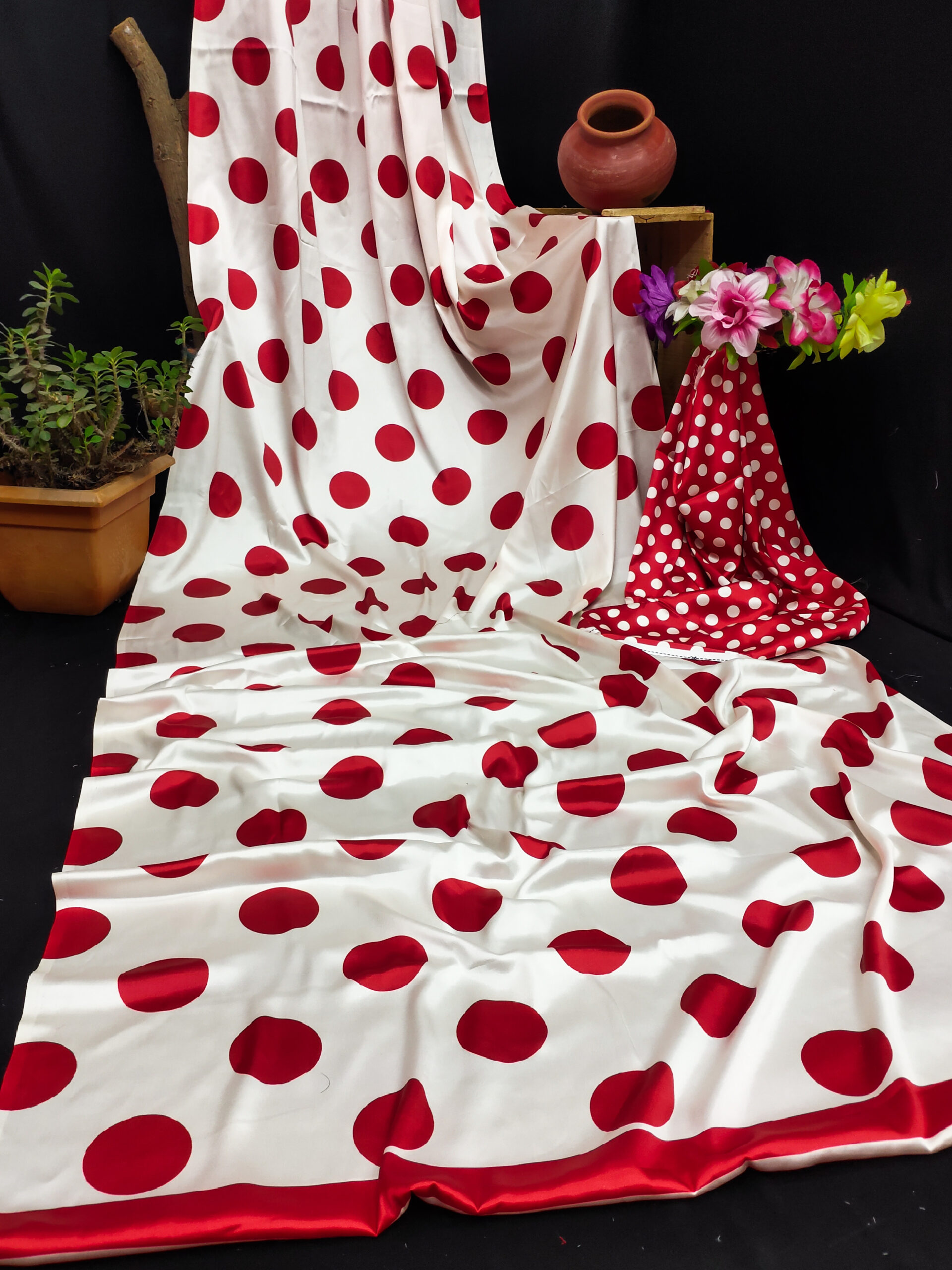 This Japanese crape saree boasts a striking and lively design with bold red polka dots evenly scattered across a pristine white satin-like fabric, exuding a blend of vintage charm and contemporary elegance. The glossy texture enhances its luxurious drape, making it a statement piece. Complementing the saree, the blouse fabric contrasts beautifully with a rich red base adorned with smaller white polka dots, creating a balanced yet eye-catching ensemble that is both playful and sophisticated.