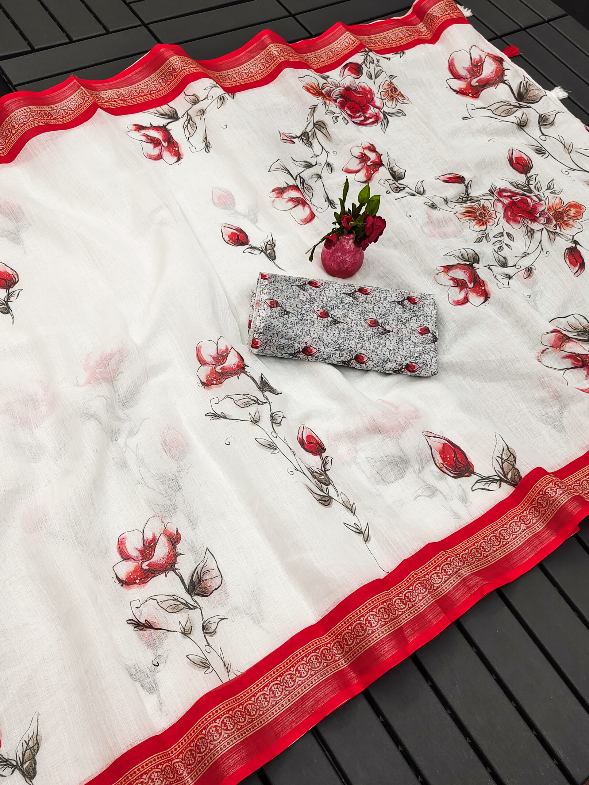 This elegant linen cotton saree features a soft off-white base adorned with delicate red and blush-toned floral prints, accented by a rich red border with intricate golden motifs. It comes with a stylish printed blouse piece in black and white with matching red floral details, offering a perfect blend of grace and charm. It is made from a soft and breathable fabric, the saree offers a smooth flow and elegant drape, ensuring a graceful and comfortable wear, perfect for casual, semi-formal events.