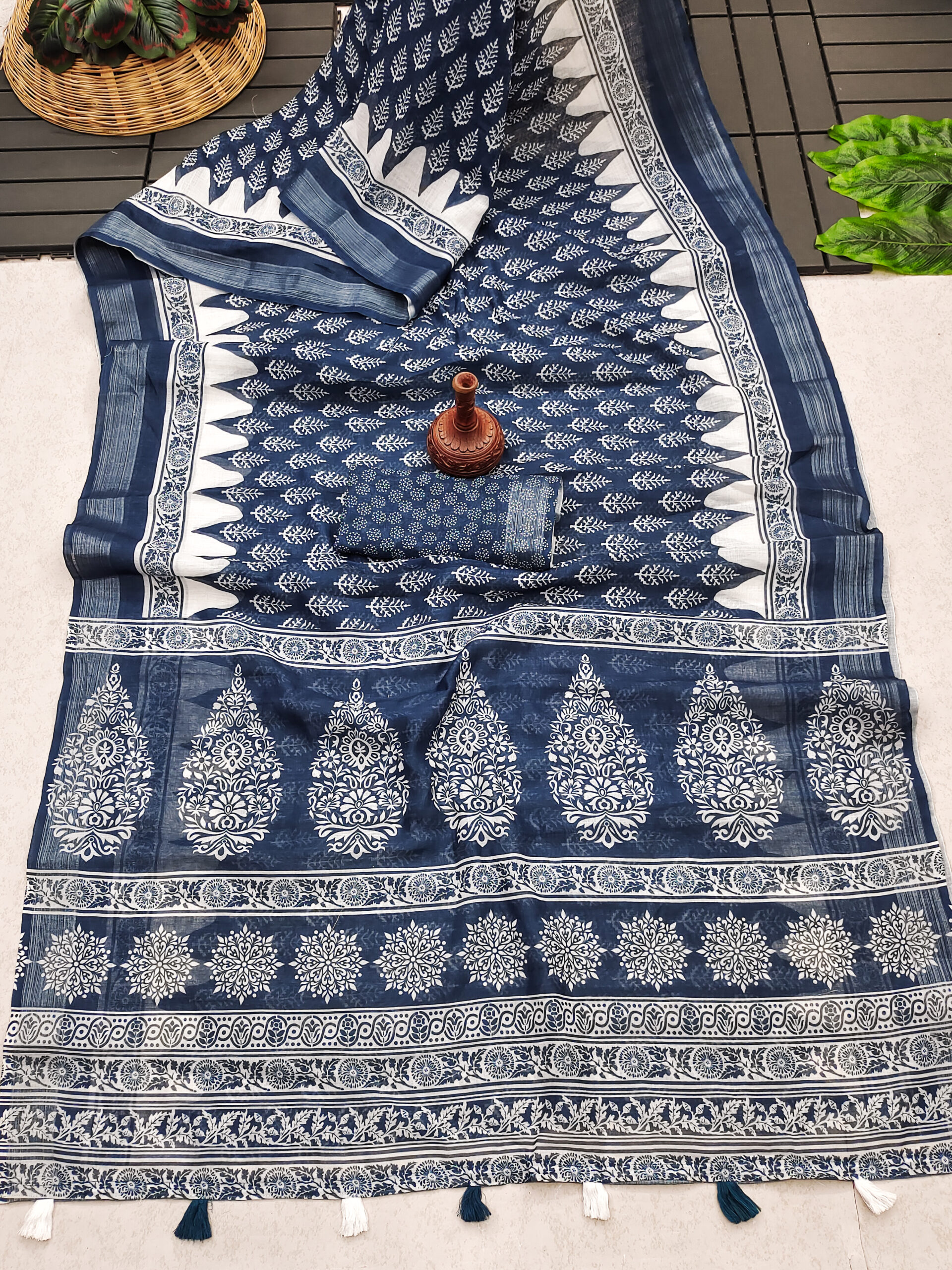 This is a stunning navy blue and white linen-cotton saree featuring intricate floral and paisley block prints. The saree is adorned with a beautifully detailed border and tassel embellishments, giving it an elegant ethnic charm. It comes with a matching navy-blue printed blouse piece to complete the look. It is made from a soft and breathable fabric, the saree offers a smooth flow and elegant drape, ensuring a graceful and comfortable wear, perfect for casual, semi-formal events.