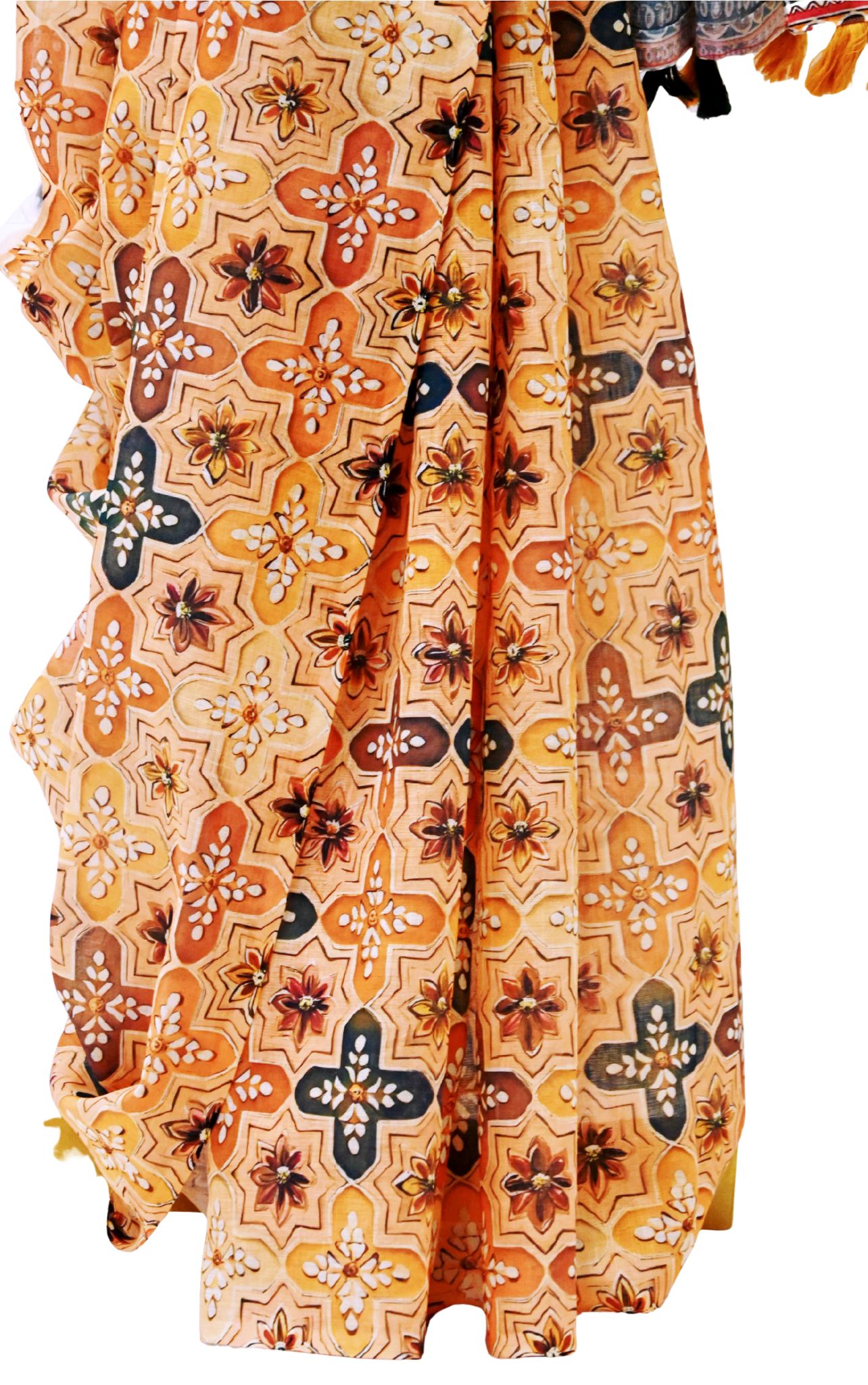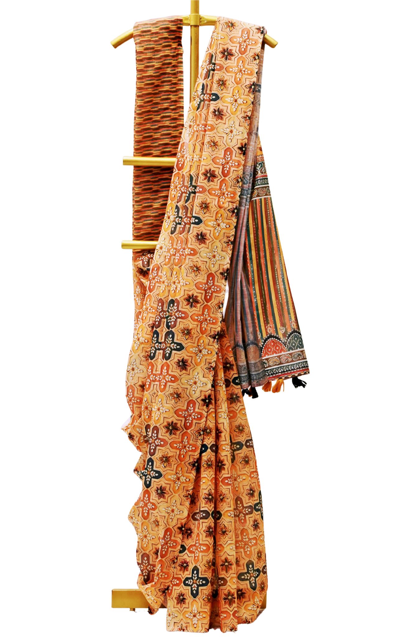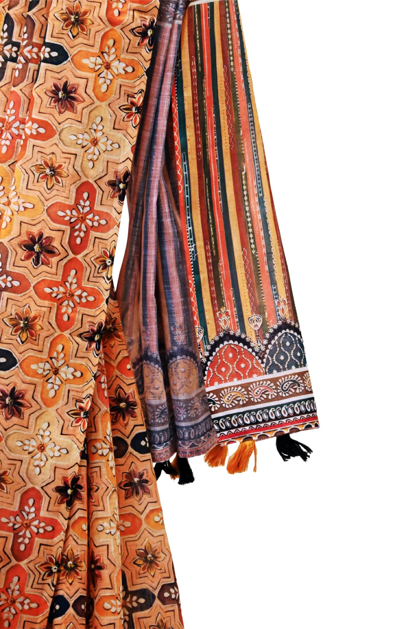 This printed linen cotton saree showcases a warm, earthy palette dominated by shades of orange, mustard, and deep green, featuring a detailed Moroccan-style floral and geometric pattern across the body. The contrasting pallu is decorated with intricate multi-colored vertical stripes and traditional motifs, while the blouse piece carries a complementary wavy striped design in matching tones.