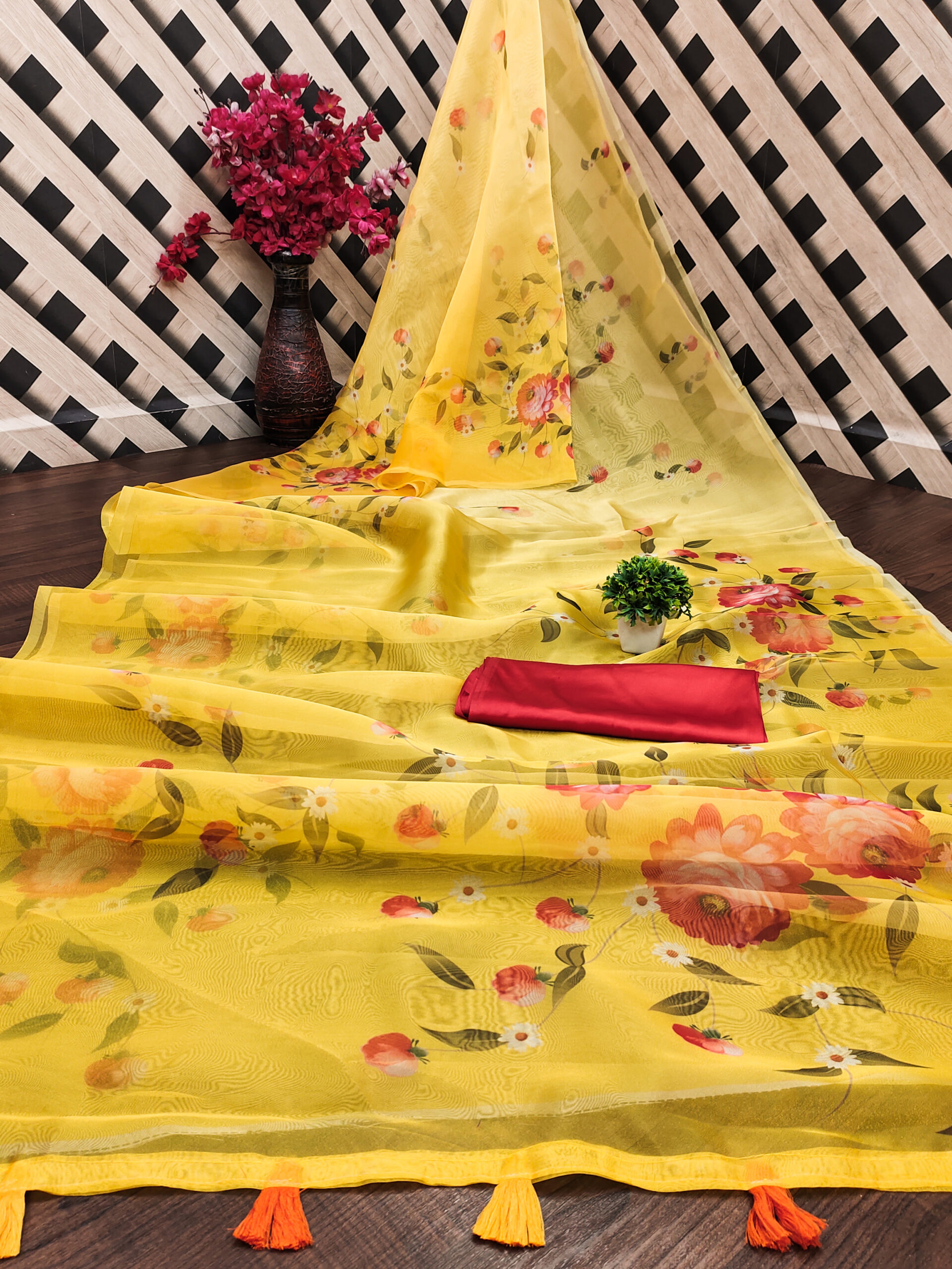 This elegant soft organza saree showcases a vibrant yellow base that radiates warmth and joy. The saree is beautifully adorned with a digital floral print featuring delicate peach, red, and white flowers with green leaves, adding a refreshing natural vibe. The airy and sheer fabric enhances its grace, making it perfect for daytime events or festive occasions. It comes with a contrasting deep red blouse piece, complementing the floral accents, while the tassel detailing in orange and yellow along the pallu adds a playful, stylish finish.