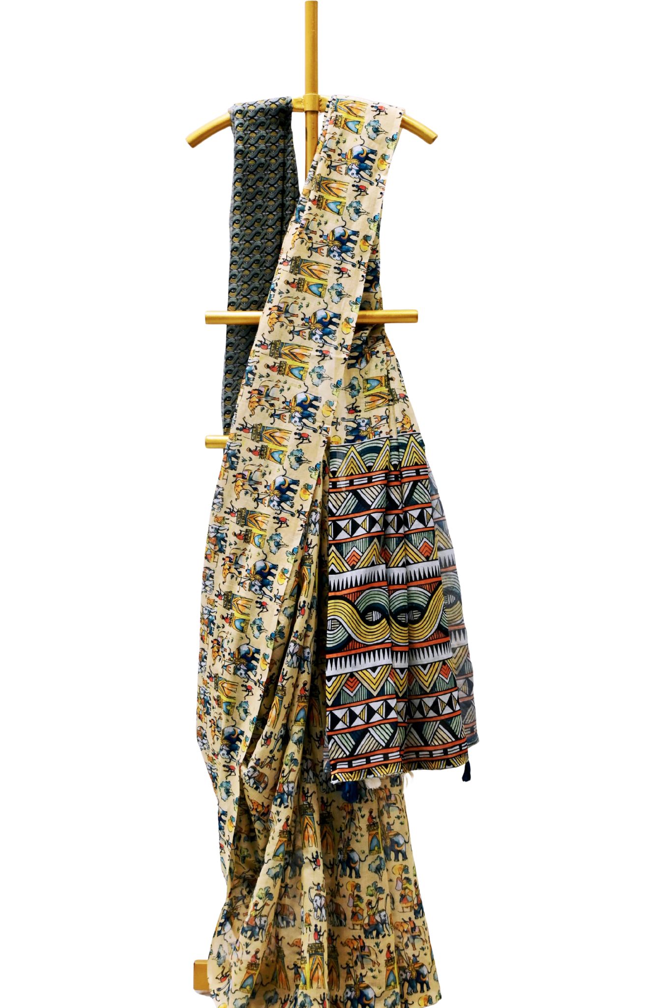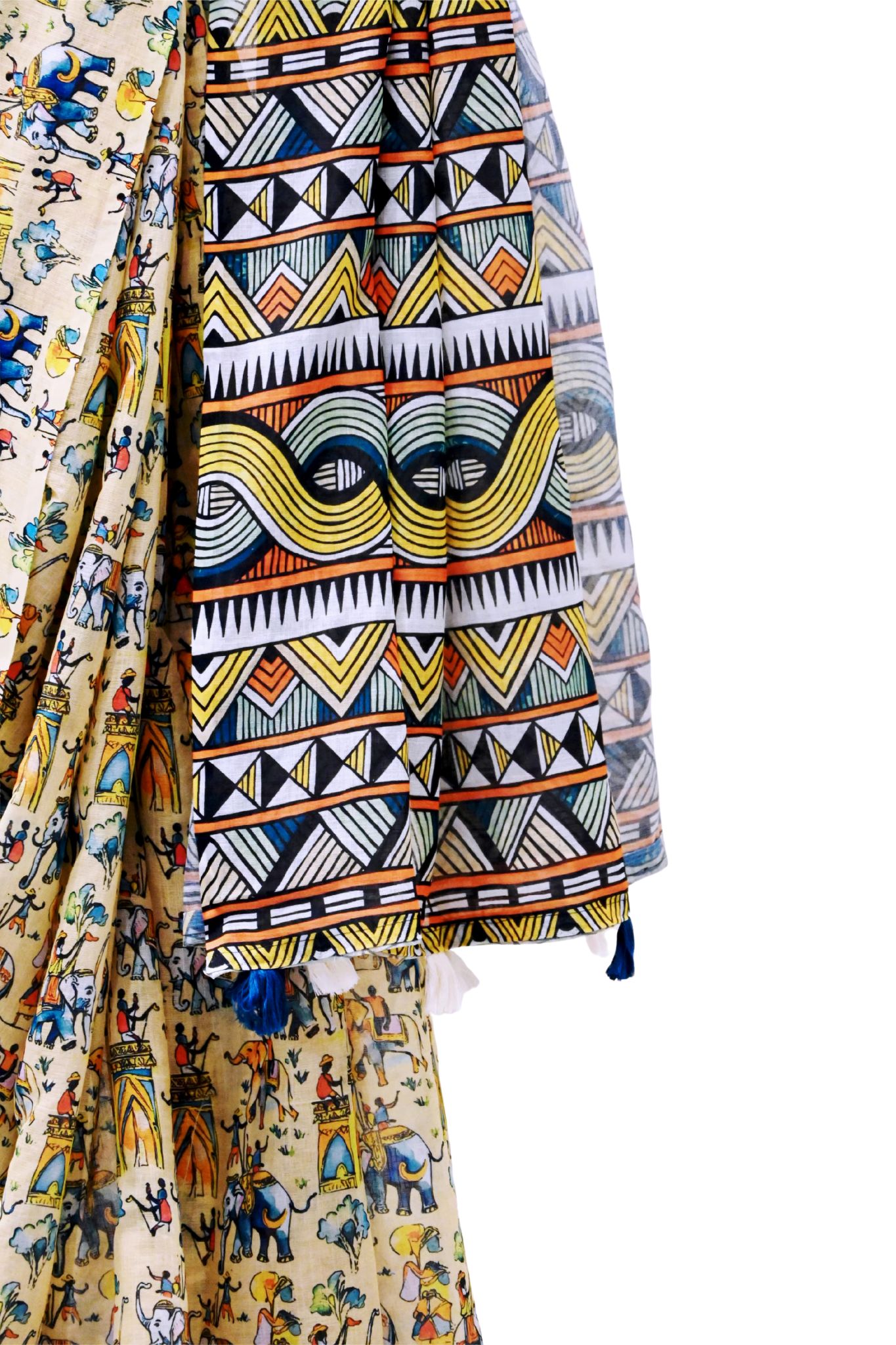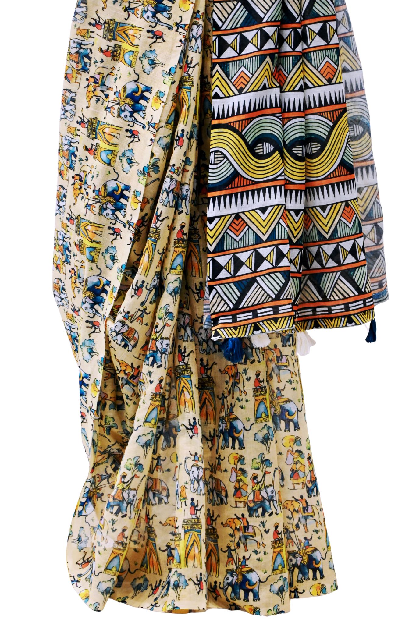 This captivating printed linen cotton saree showcases a beige base adorned with vibrant traditional elephant and temple motifs in shades of blue, orange, green, and yellow, evoking a rich Indian folk-art aesthetic. The blouse piece features a geometric dark green print that contrasts beautifully with the saree’s motifs, while the pallu stands out with striking multi-coloured tribal-inspired patterns in black, red, yellow, and green, adding an artistic edge to the ensemble.