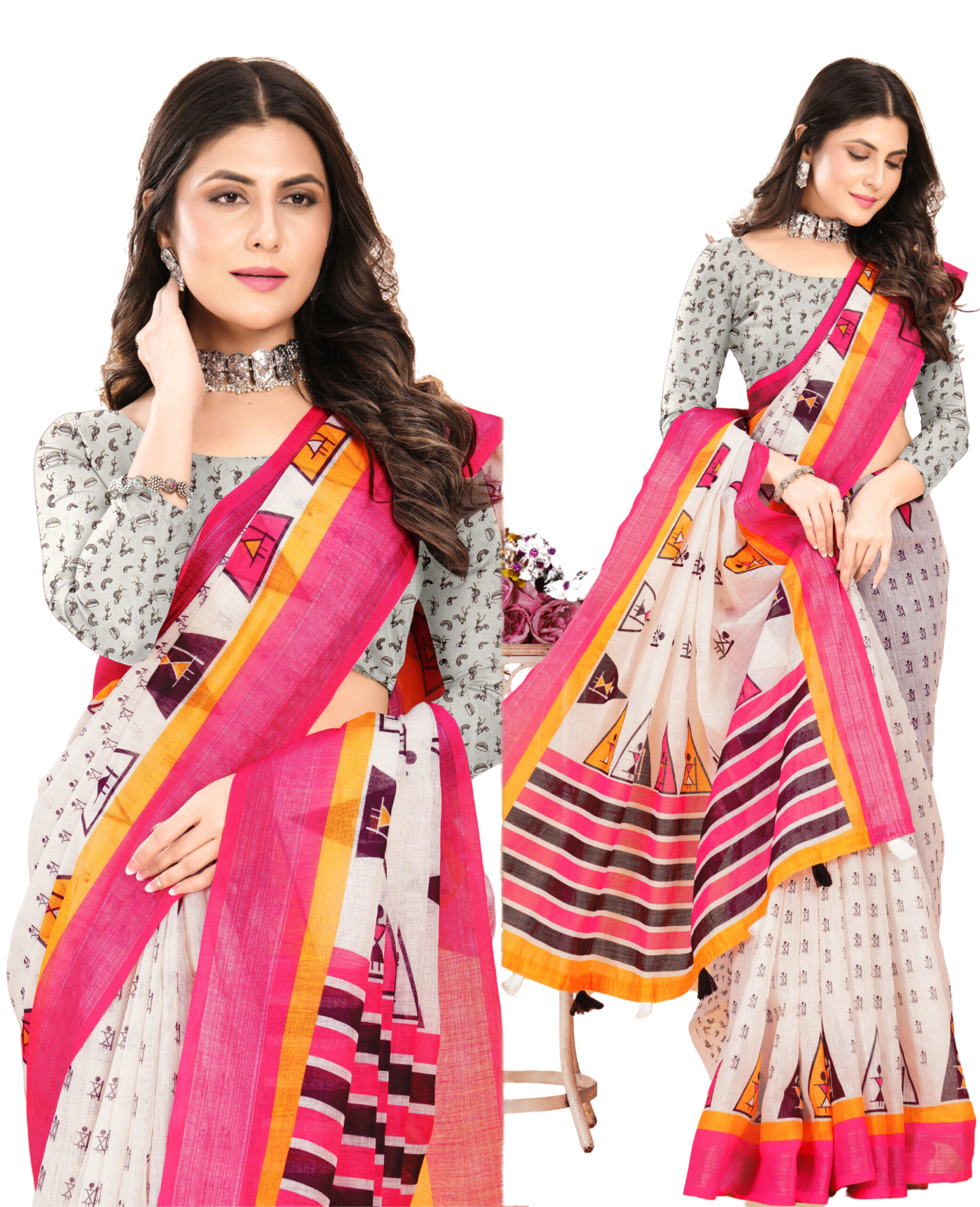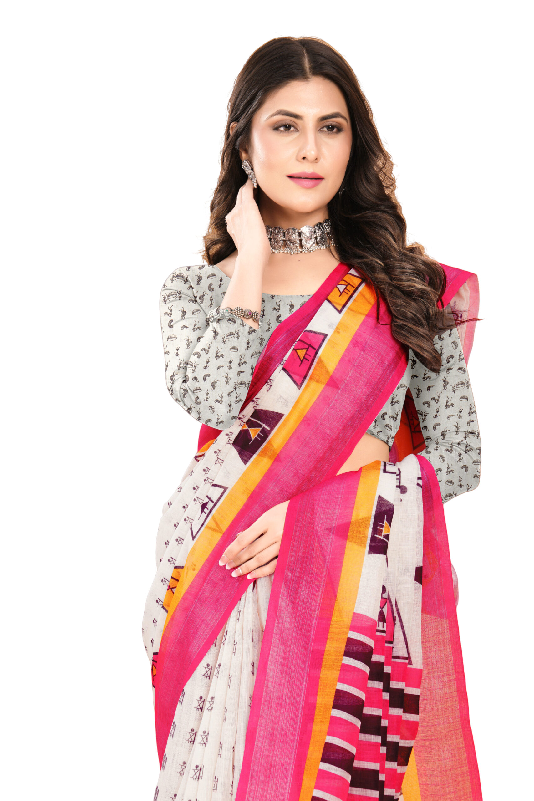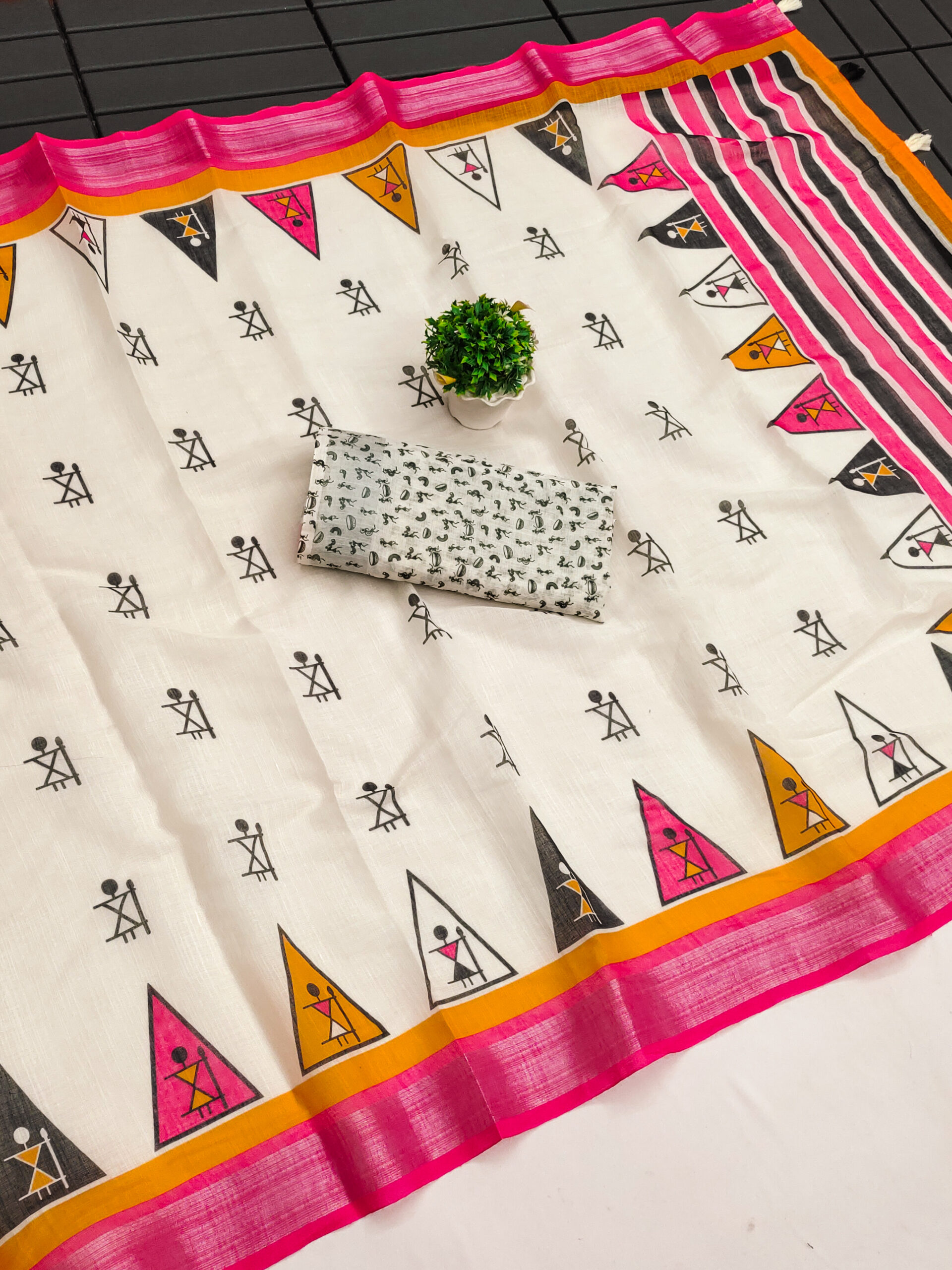 This is a beautiful linen cotton saree featuring a white base adorned with traditional Warli art-inspired stick figure motifs in black. The border is highlighted with vibrant pink, orange, and black triangular patterns, adding a lively touch. It comes with a contrasting blouse piece in a monochrome design, enhancing the saree’s artistic appeal. It is made from a soft and breathable fabric, the saree offers a smooth flow and elegant drape, ensuring a graceful and comfortable wear, perfect for casual, semi-formal events.