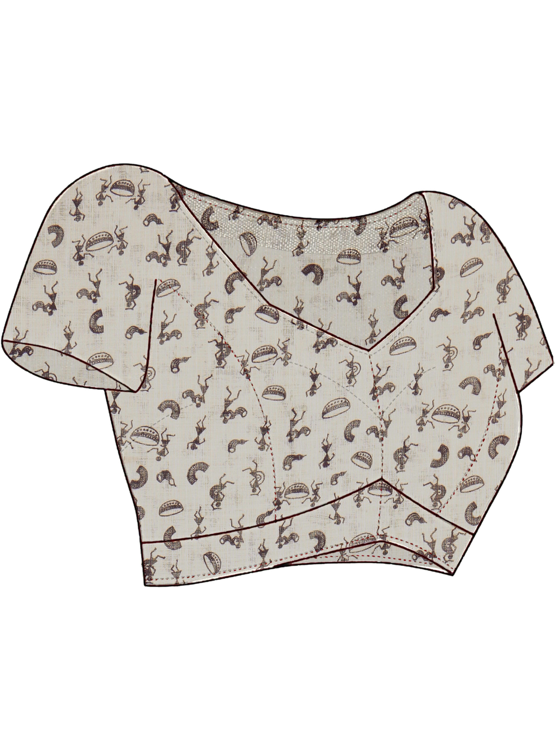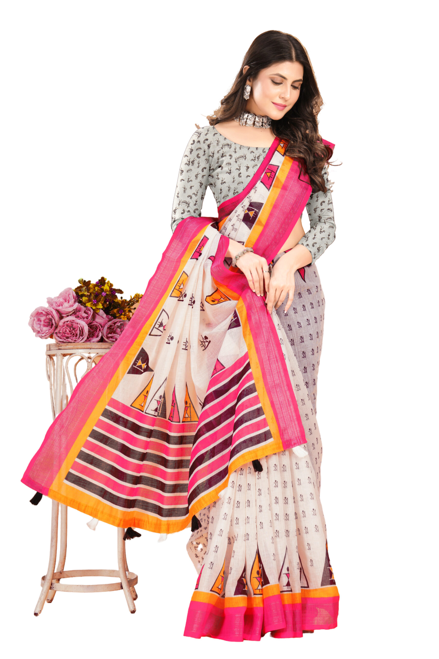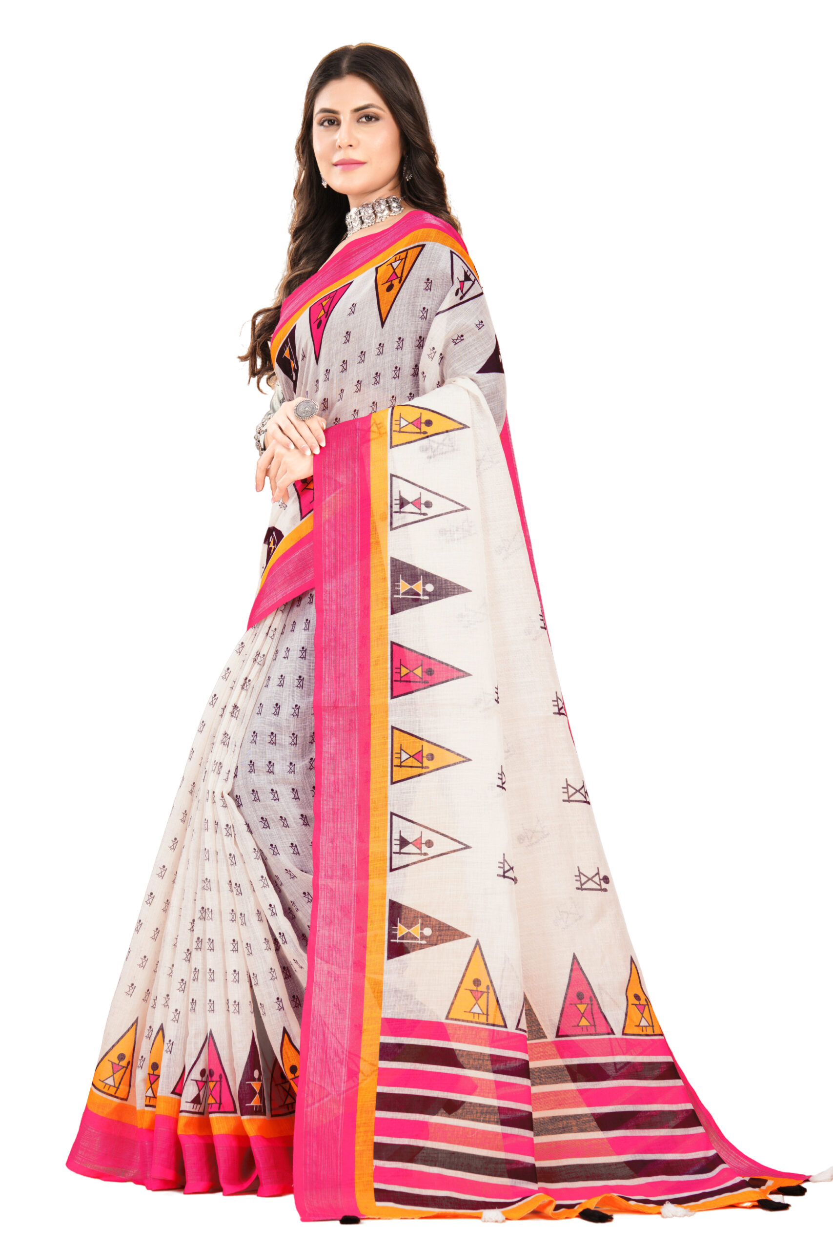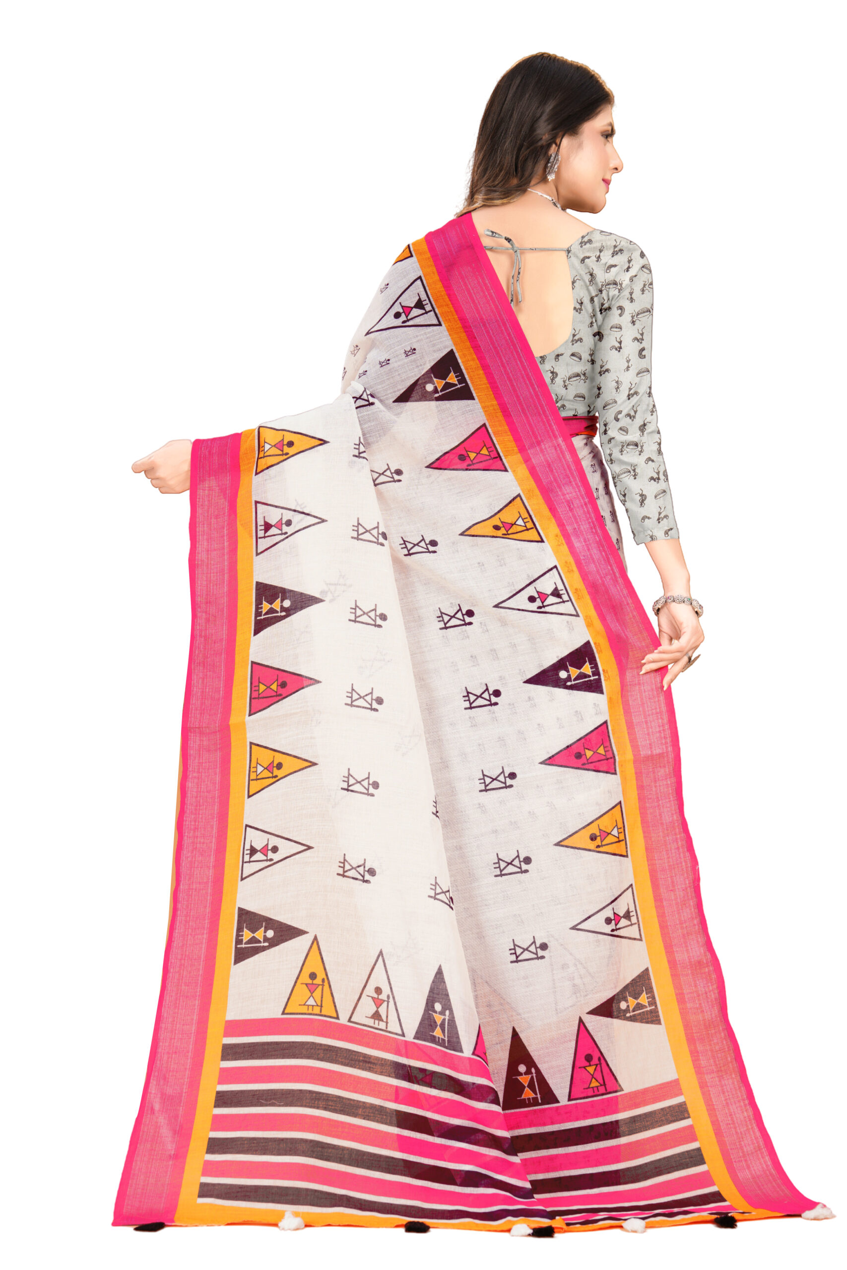 This is a beautiful linen cotton saree featuring a white base adorned with traditional Warli art-inspired stick figure motifs in black. The border is highlighted with vibrant pink, orange, and black triangular patterns, adding a lively touch. It comes with a contrasting blouse piece in a monochrome design, enhancing the saree’s artistic appeal. It is made from a soft and breathable fabric, the saree offers a smooth flow and elegant drape, ensuring a graceful and comfortable wear, perfect for casual, semi-formal events.