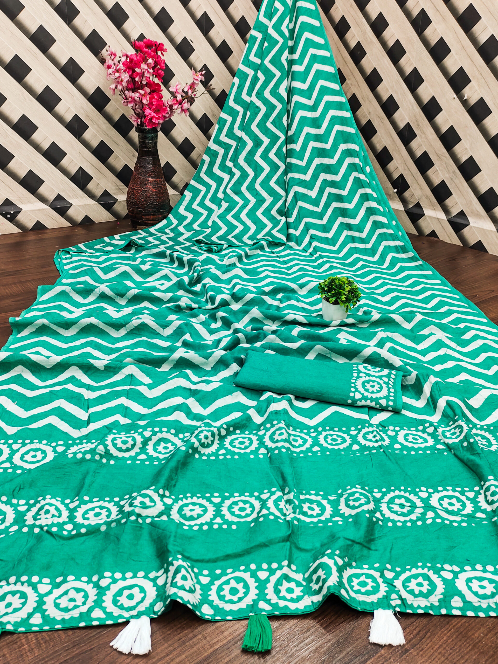 This hand-wax batik saree showcases a rama green base with intricate white patterns created using traditional wax-resist dyeing techniques. The saree features bold zigzag designs across the body, while the pallu is adorned with circular and geometric motifs, adding a classic artistic touch. The handcrafted detailing enhances its elegance, making it a perfect blend of heritage and style. It is made from a soft and breathable fabric, the saree offers a smooth flow and elegant drape, ensuring a graceful and comfortable wear, perfect for casual, semi-formal events or festive occasions.