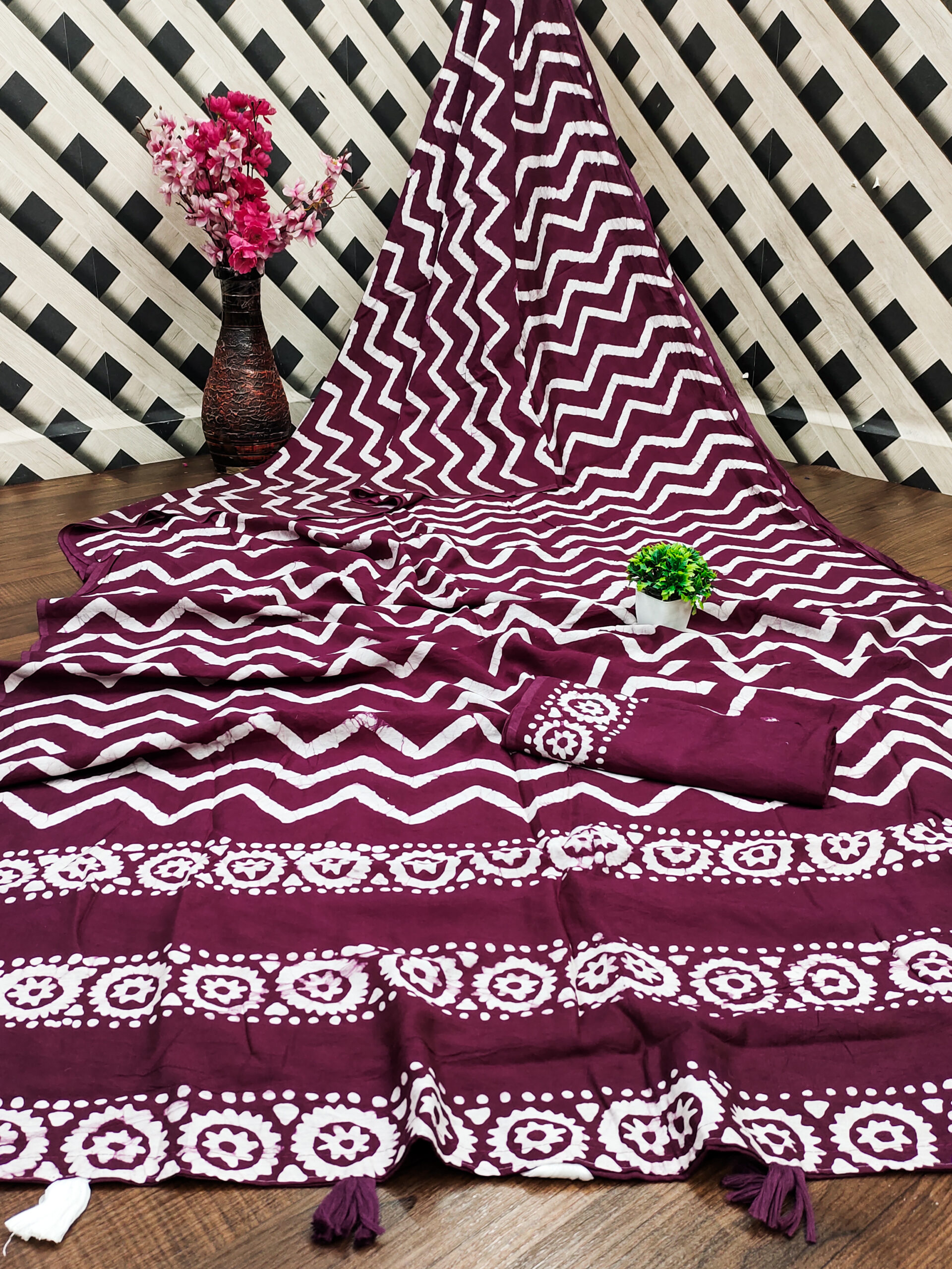 This hand-wax batik saree showcases a wine colour base with intricate white patterns created using traditional wax-resist dyeing techniques. The saree features bold zigzag designs across the body, while the pallu is adorned with circular and geometric motifs, adding a classic artistic touch. The handcrafted detailing enhances its elegance, making it a perfect blend of heritage and style. It is made from a soft and breathable fabric, the saree offers a smooth flow and elegant drape, ensuring a graceful and comfortable wear, perfect for casual, semi-formal events or festive occasions.