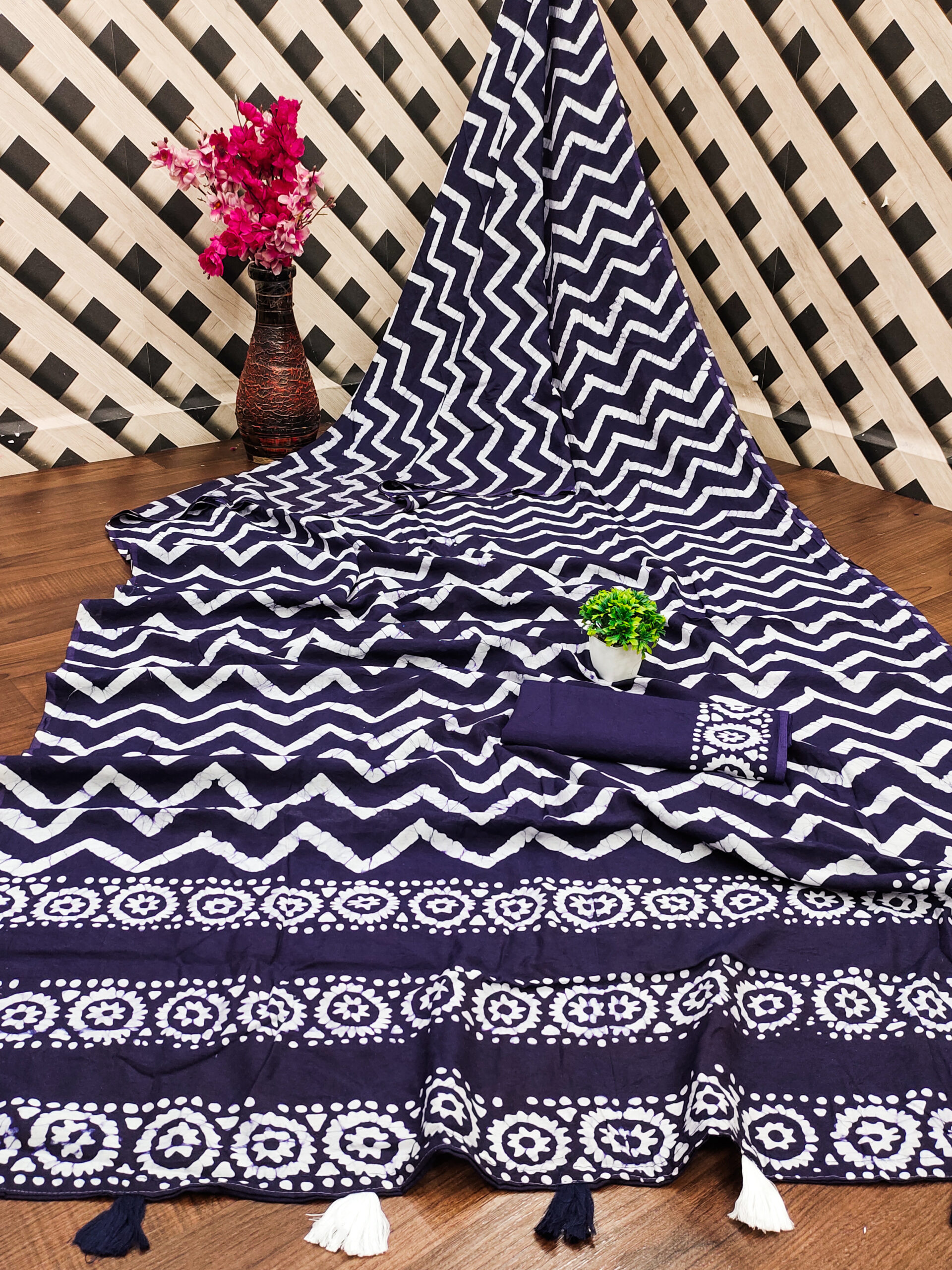 This hand-wax batik saree showcases a navy blue base with intricate white patterns created using traditional wax-resist dyeing techniques. The saree features bold zigzag designs across the body, while the pallu is adorned with circular and geometric motifs, adding a classic artistic touch. The handcrafted detailing enhances its elegance, making it a perfect blend of heritage and style. It is made from a soft and breathable fabric, the saree offers a smooth flow and elegant drape, ensuring a graceful and comfortable wear, perfect for casual, semi-formal events or festive occasions.